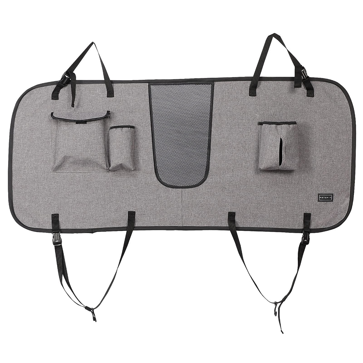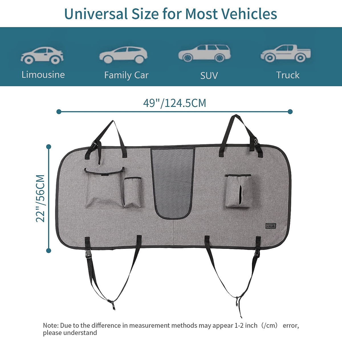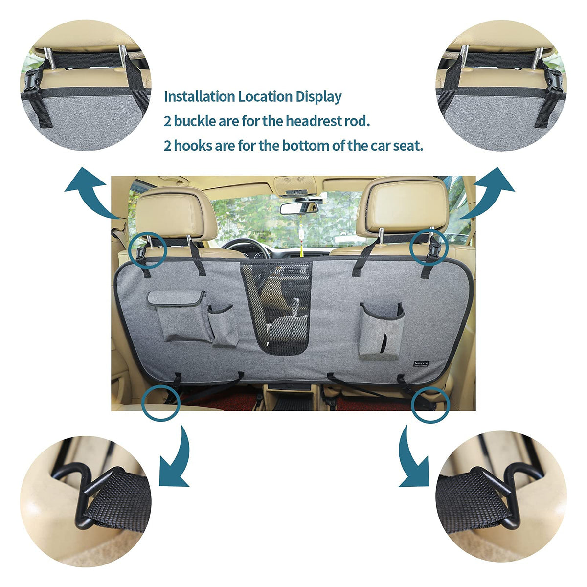 Save Potential Danger. This dog barrier for car is the perfect way for you to set boundaries to your dog or messy toddler keeps him safe and your eyes on the road with fewer distractions. Recommend for those whom like to take car rides with their fur baby but don t want him to disturb driving and put both of you at risk. Universal Fitment. Upgraded the size to 49 x 22(when unfolding) the car dog barrier will fit most cars and SUVs with separate adjustable headrests. To determine if it will fit please measure the width of your vehicles interior just below the headrests. User-friendly Design. Made of durable material Petsfit auto dog car net barrier with a perfect size helps keep effectively the dog from sneaking into the front seat. The breathable and scratch-resistant fine mesh construction not only prevents dogs leg from being stuck in the mesh but also allows air back to him and not blocking your view to each other. convenient Quick Installation. Unlike the metal barriers Petsfit dog net barrier for car is easier to detach and reattach as needed. Fasten the 2 durable top buckles on the headrests then hook the 2 sturdy hooks to the front seat rails or bottom grooves. When not in use you could fold it to storage. Space-saving Organizer. Its a multi-function dog car divider back seat barrier with 3 pockets that the largest pocket has a lid to prevent items from falling you could use the barrier as a car space-saving organizer for storing stuff like tissue paper phone gloves sunglasses.