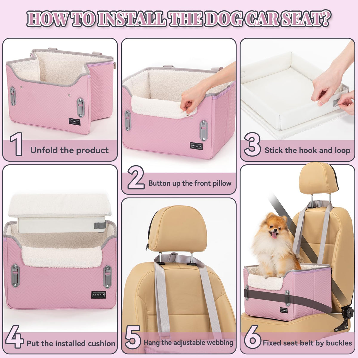 Q: How do I install the PETSFIT Dog Car Seat in my vehicle?A: The dog car seat features adjustable hang webbing and patented buckles, allowing for easy installation. Simply secure the seat belt of your car to the seat using these features.