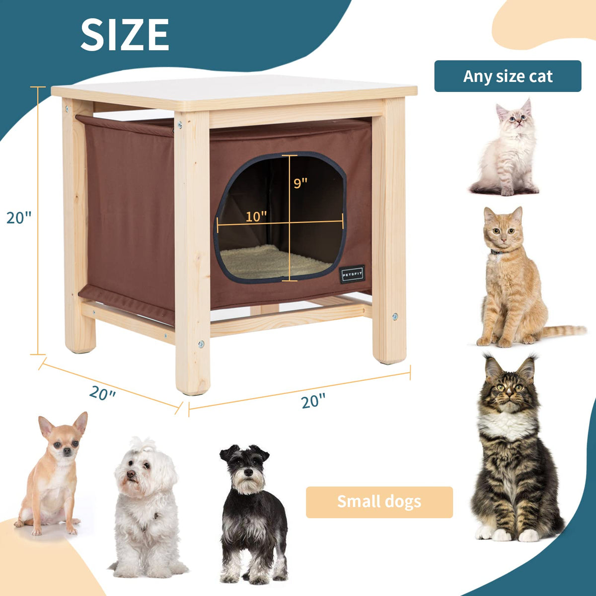 The size of the small dog house is 20''L*20''W*20''H and the cat condo opening is 10''L*9''H which ensures cats won't be stuck fit for any size cats and small dogs. The cat house for indoor cats is stylish and easy to assemble you can complete installation in 20mins. Our cat hideaway for cats or small dogs to hide and sleep fits most room decors well indoors.