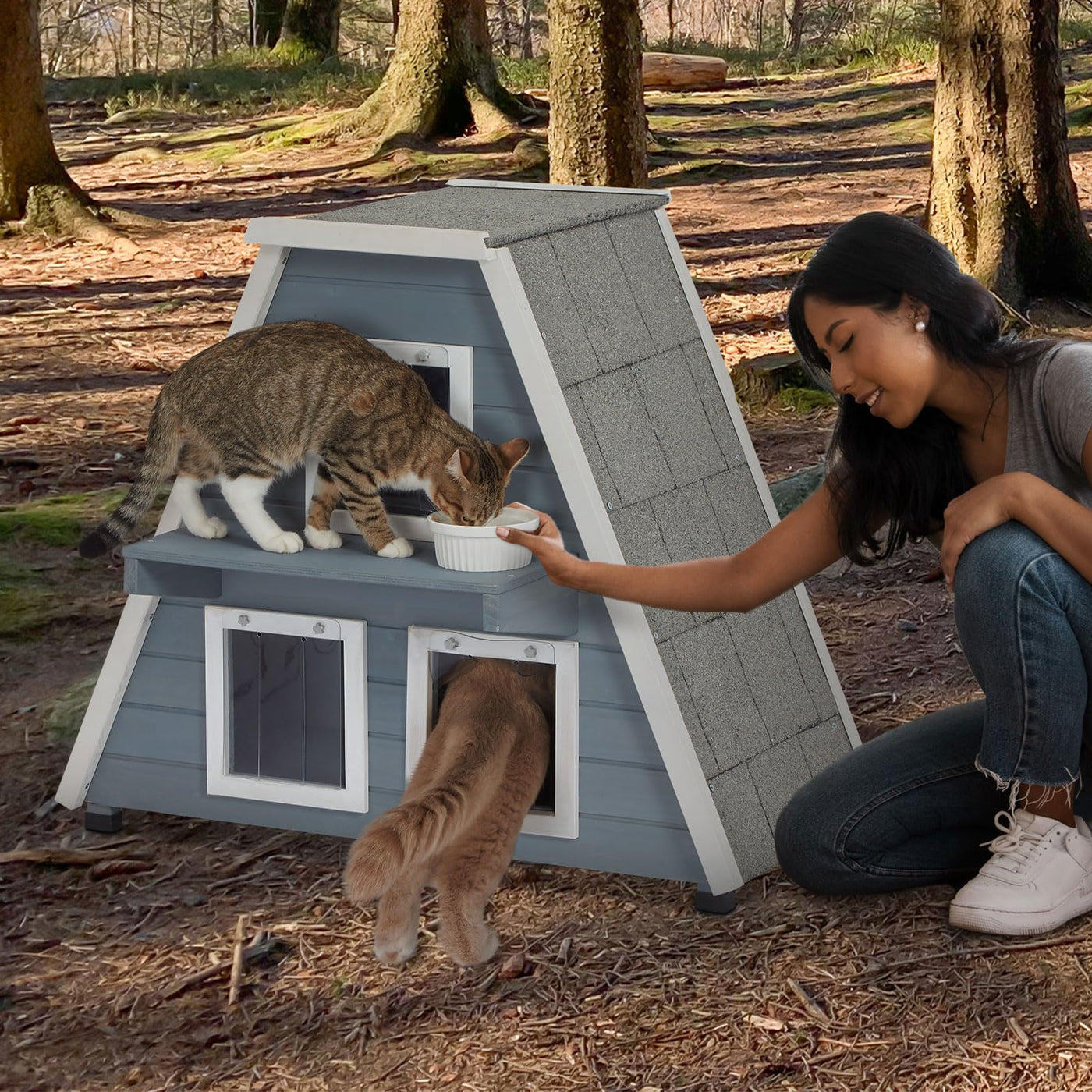 Petsfit Outdoor Cat House For Winter, Insulated Cat House Outdoor- 3 Sided Weatherproof Asphalt Roof, 3 Doors With Escape Door, Outdoor Small Rabbit Hutch Grey