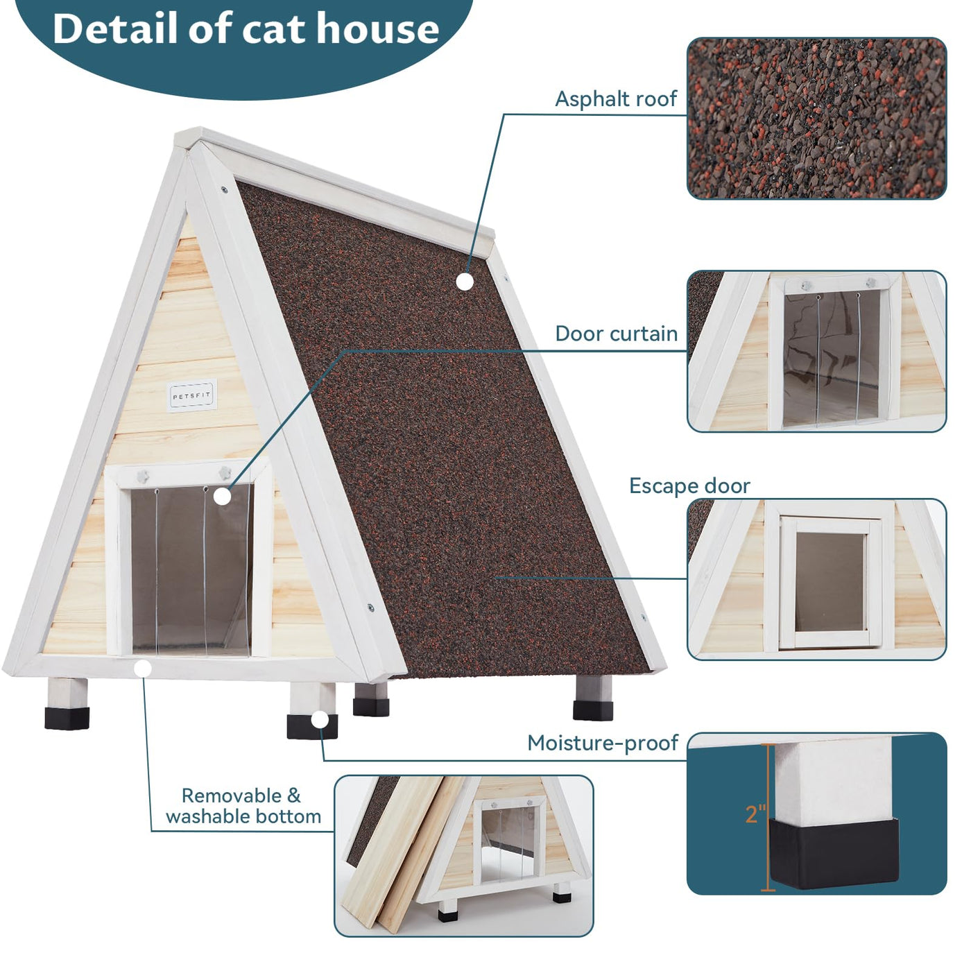 Q: What materials are used in the construction of the Petsfit Outdoor Cat House?A: The Petsfit Outdoor Cat House is made from durable wood, ensuring longevity and providing a safe and comfortable shelter for your feline friend.
