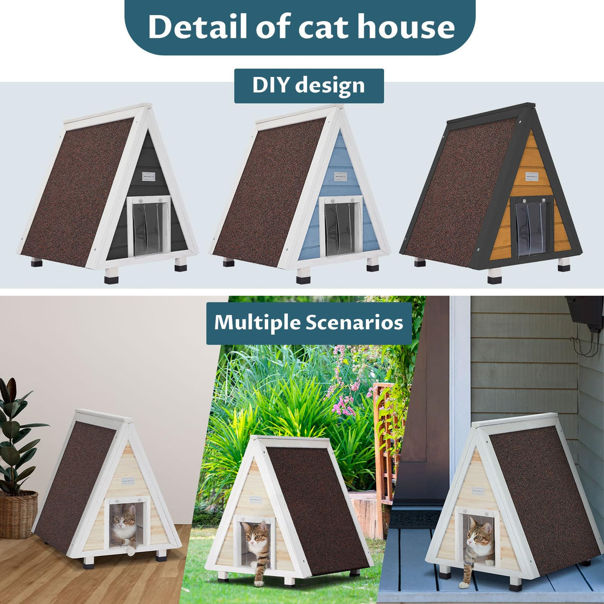 Versatile Placement Options: This triangular outdoor cat house weatherproof is compact and eye-catching in design. Our cat house design is durable and can be used both indoors and outdoors. It can be placed not only in fields courtyards or porches but also in indoor corners and walls