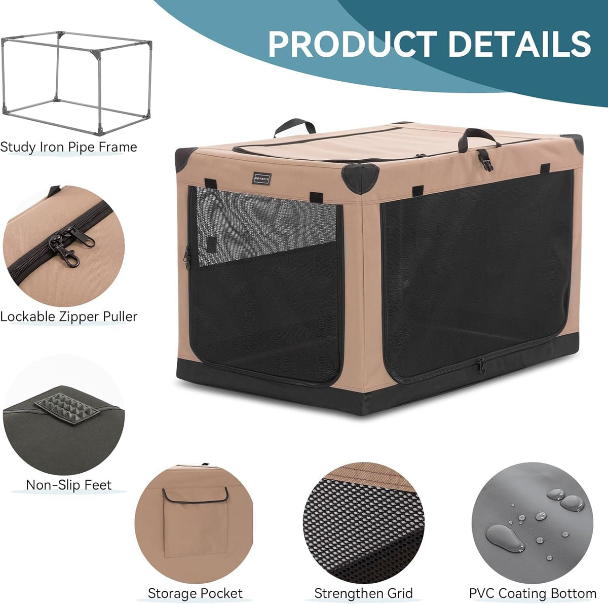 Petsfit Portable Dog Crate, Soft Sided Dog Crate - 26 Inch Lightweight, Easy Setup, Sturdy Dog Travel Crate, Adjustable Framework With 3 Mesh Door, Collapsible Dog Kennel Khaki