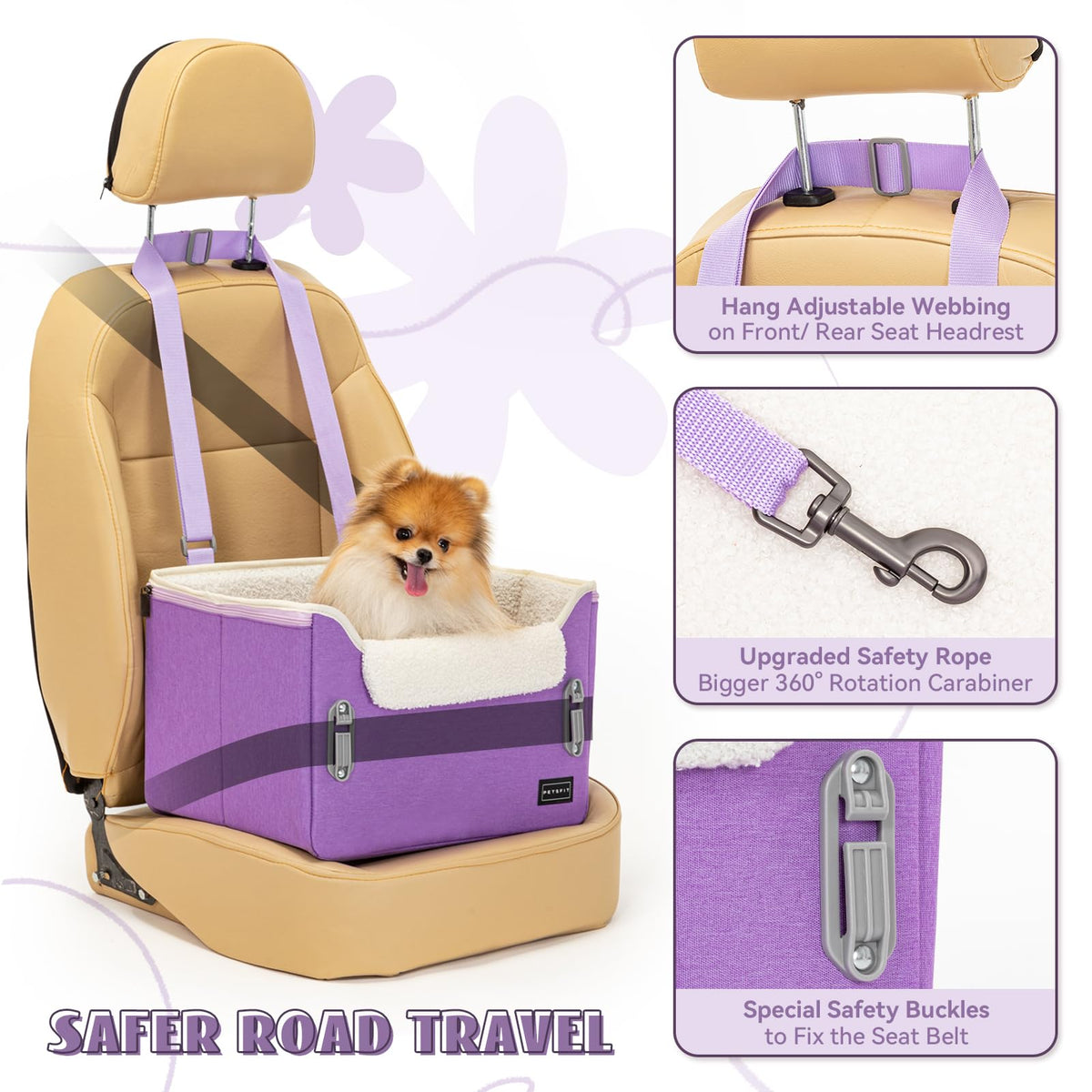 PETSFIT Small Dog Car Seat Puppy Portable Dog Booster seat for Car with Clip-On Leash Adjustable Straps Suitable for Small Pets Up to 25lbs (Purple)