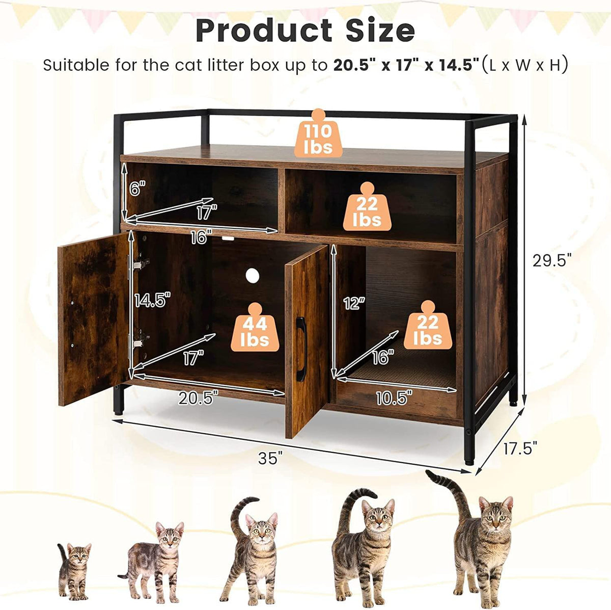 Description: Our litter box enclosure features ventilation holes and double doors that provide ventilation and privacy, making it the ideal place to hide your cat's litter box. Besides, there is a entry between the cabinet and the shelf for easy access to the cat scratch pad placement compartment. The thick cat scratch pad can withstand the frequent scratching of your beloved pet's sharp claws, thus protecting your furniture. Meanwhile, it spacious table top and 2 compartments provide ample space for storing some of your daily necessities. Therefore, our litter box enclosure is a perfect laundry storage cabinet and living room side table. Moreover, with a reinforced metal frame, adjustable feet, and an anti-tip device, our cat house performed well in both safety and stability, so you can buy with confidence. Features: Double door cabinet is an ideal solution for your cat litter box 2 compartments and large tabletop enable you store various items Wear-resistant cat scratch cardboard releases cats' scratching instinct Inner entry is convenient for cats to walk from cabinet to scratch board 3 built-in vented holes ensure excellent ventilation Equipped with an anti-toppling device to avoid wobbling Solid metal frame enhances overall stability and weight capacity 3-sided guardrails on tabletop prevent your stuff from falling 4-Adjustable feet help the cat litter box enclosure adapt to uneven grounds Specifications: Color: Coffee, Black, Marble Material: MDF, Metal Product Dimensions: 35 x 17.5 x 29.5 inch (L x W x H) Net Weight: 60.5 lbs