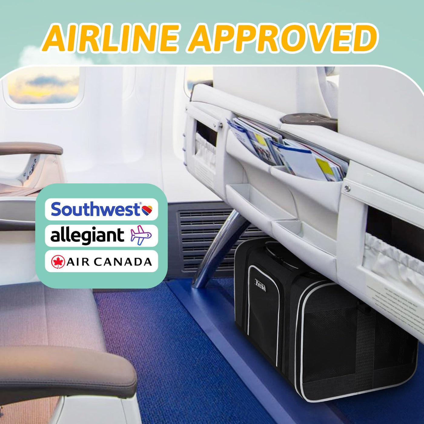 Q: Is the Petskd Pet Carrier airline approved?A: Yes, the Petskd Pet Carrier is airline approved and designed to fit under the seat in the cabin. It meets the requirements for Southwest Airlines and is also compliant with Air Canada specifications.