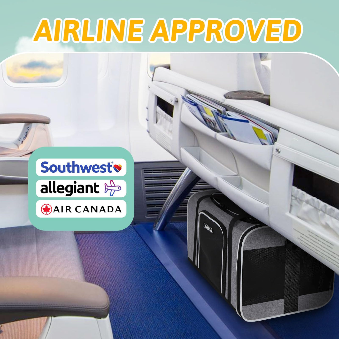 Q: Is the Petskd Pet Carrier airline approved?A: Yes, the Petskd Pet Carrier is airline approved and can be placed under the seat in the cabin. It is primarily designed for Southwest Airlines but also complies with Air Canada regulations.