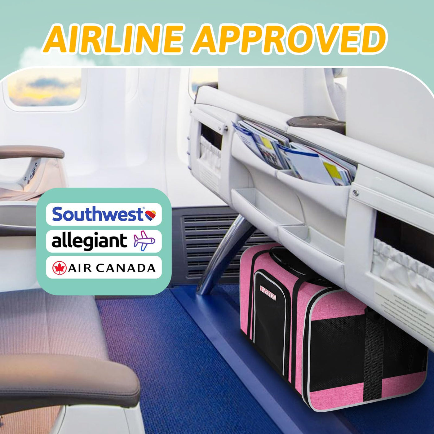 Q: Is the Petskd Pet Carrier approved for Southwest Airlines?A: Yes, the Petskd Pet Carrier is airline approved for Southwest Airlines, with dimensions of 17"L x 13"W x 9.5"H, allowing it to fit under the cabin seat.