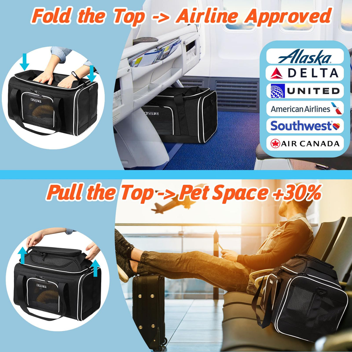 Q: Is the Petskd Top-Expandable Pet Carrier airline approved?A: Yes, the Petskd Top-Expandable Pet Carrier is TSA approved and designed to fit under the seat on various airlines, including Alaska Airlines, Southwest Airlines, and Delta Airlines.