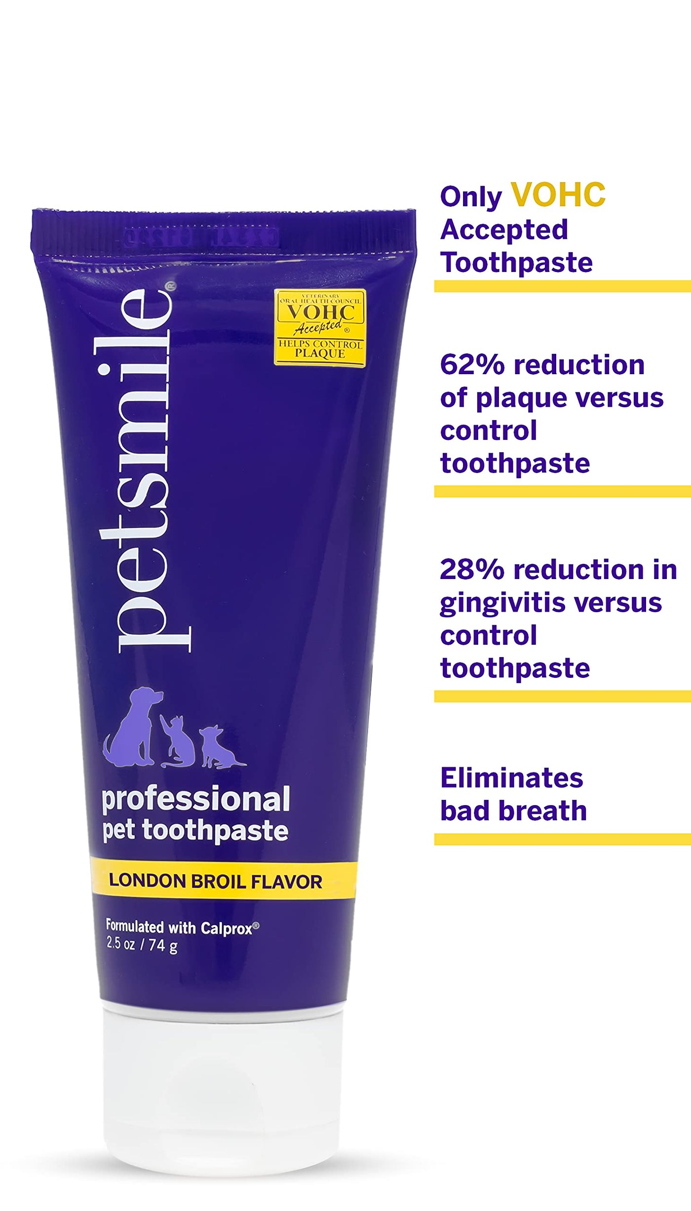Petsmile is the only VOHC approved toothpaste for you pet with Calprox. Veterinarians choose Petsmile because of the high-quality ingredients that promote white teeth and healthy gums. The VOHC recognizes that Petsmile meets the highest standards for your pets oral health. Using Petsmile toothpaste and brushing daily will significantly improve your pets dental health. Petsmiles proprietary formula Calprox is clinically proven to inhibit plaque and tartar buildup, while whitening teeth by gently dissolving the protein pellicle. The protein pellicle is the thin bio-film that forms on the surface of the teeth, to which plaque, bacteria, and stains adhere. Removing the pellicle leaves your pets teeth cleaner and whiter while improving hygiene, gum health and providing kissable fresh breath. The no-brushing required formula makes it easy to improve and maintain even the fussiest pets oral health. Simply apply Petsmile toothpaste on your cat or dogs teeth and let their tongue do the rest. Your pet can immediately eat or drink after applying Petsmile toothpaste. For best results, we recommend brushing your pets teeth with our Professional Pet Toothbrush once or twice a day. The great flavors, Rotisserie Chicken, Say Cheese, & London Broil will keep your pet looking forward to their next brushing. Ingredients include Water (Aqua), Glycerin, Dicalcium Phosphate Dihydrate, Citric Acid, Calprox (Calcium Peroxide), Flavor, Sodium Carboxymethyl Cellulose, Urea Peroxide, Phosphoric Acid, Sodium Benzoate, EDTA, Cetyl Pyridinium Chloride, Carbomer, Potassium Hydroxide, Xanthan Gum. By using only human-grade ingredients, you can be certain that your pet is using the highest quality pet toothpaste on the market. Pet smile toothpaste is vegan, hypoallergenic and made from only the highest quality ingredients that promote healthy teeth and gums.