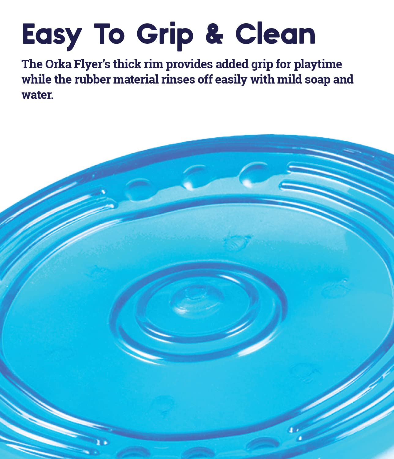 Q: How should I clean the Orka Flyer disc?A: To clean the Orka Flyer, simply use mild soap and water. This will help maintain its durability and keep it safe for your dog.