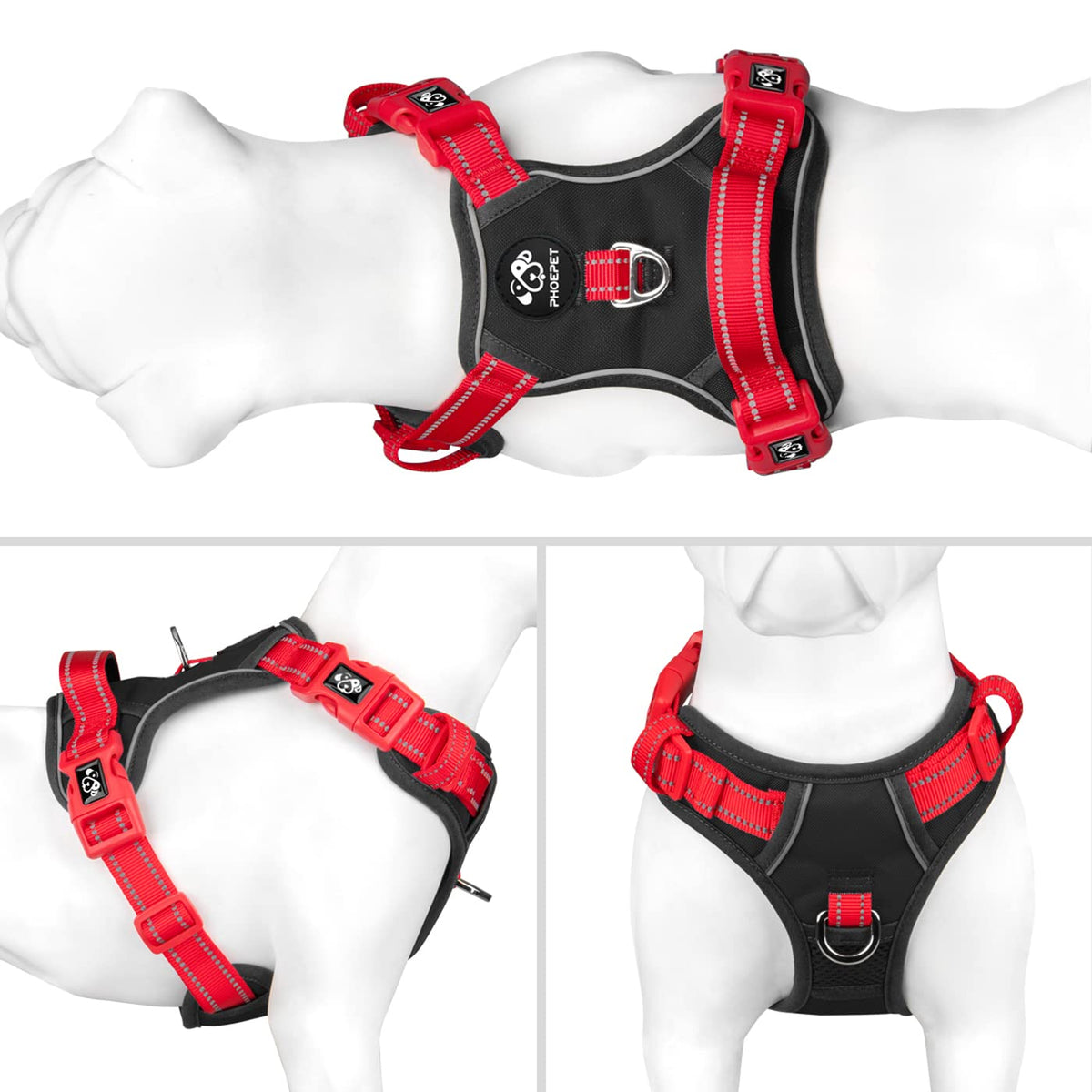 PHOEPET No Pull Dog Harness Unique Colors Reflective Adjustable Dog Vest with Soft Training Handle Metal Clips for Small Medium Large Dogs (Black Base & Red Straps L)