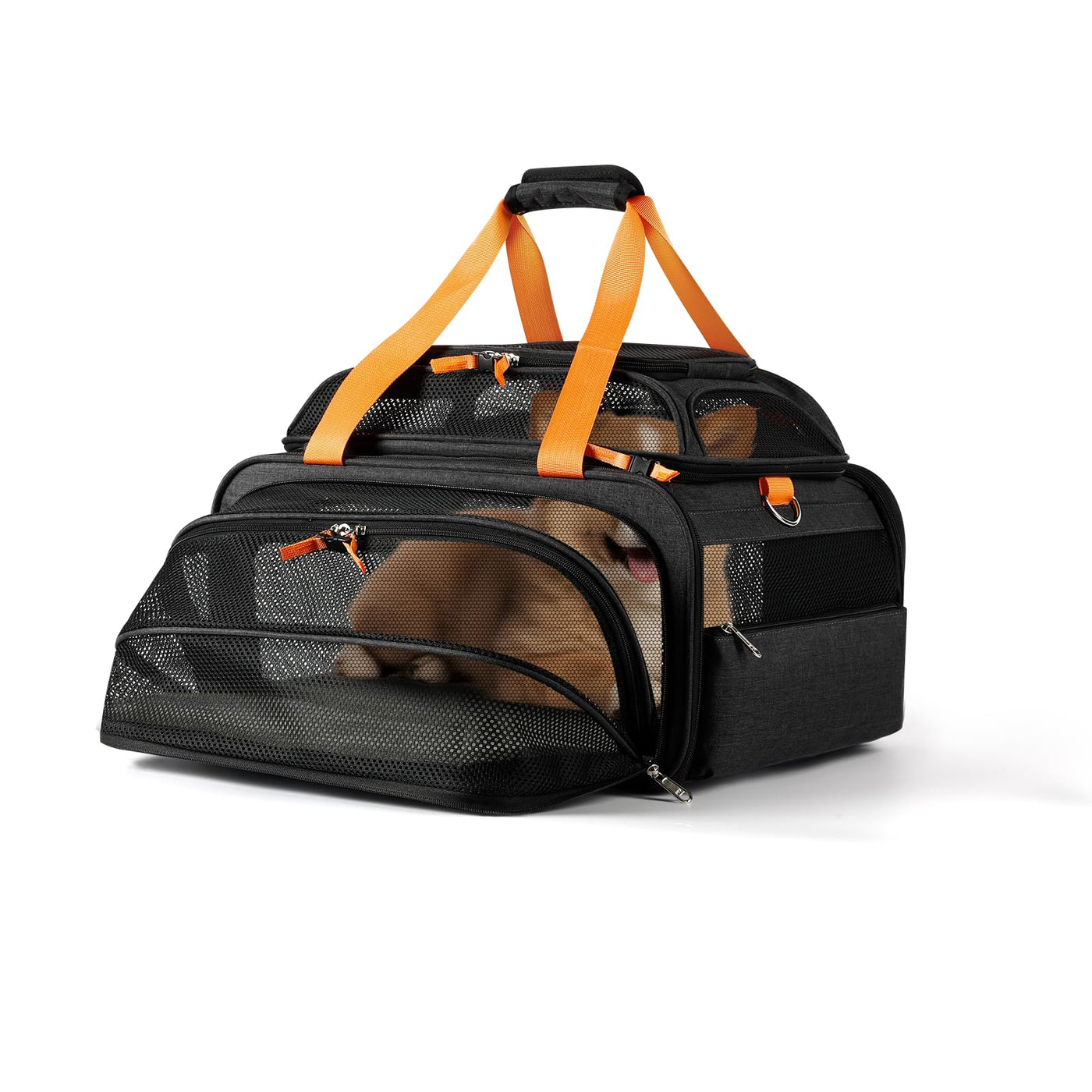 ?Expandable part provide more space for your pet? This carrier have a 3'' height expandable top you can fold it down to put carrier under seat in cabin and pull it up to giving more space for pet in other travel time.This carrier also have a accordion-style expandable part in side to providing more space in travel(like backseat in car/ airport when waiting for boarding/space underseat in cabin).