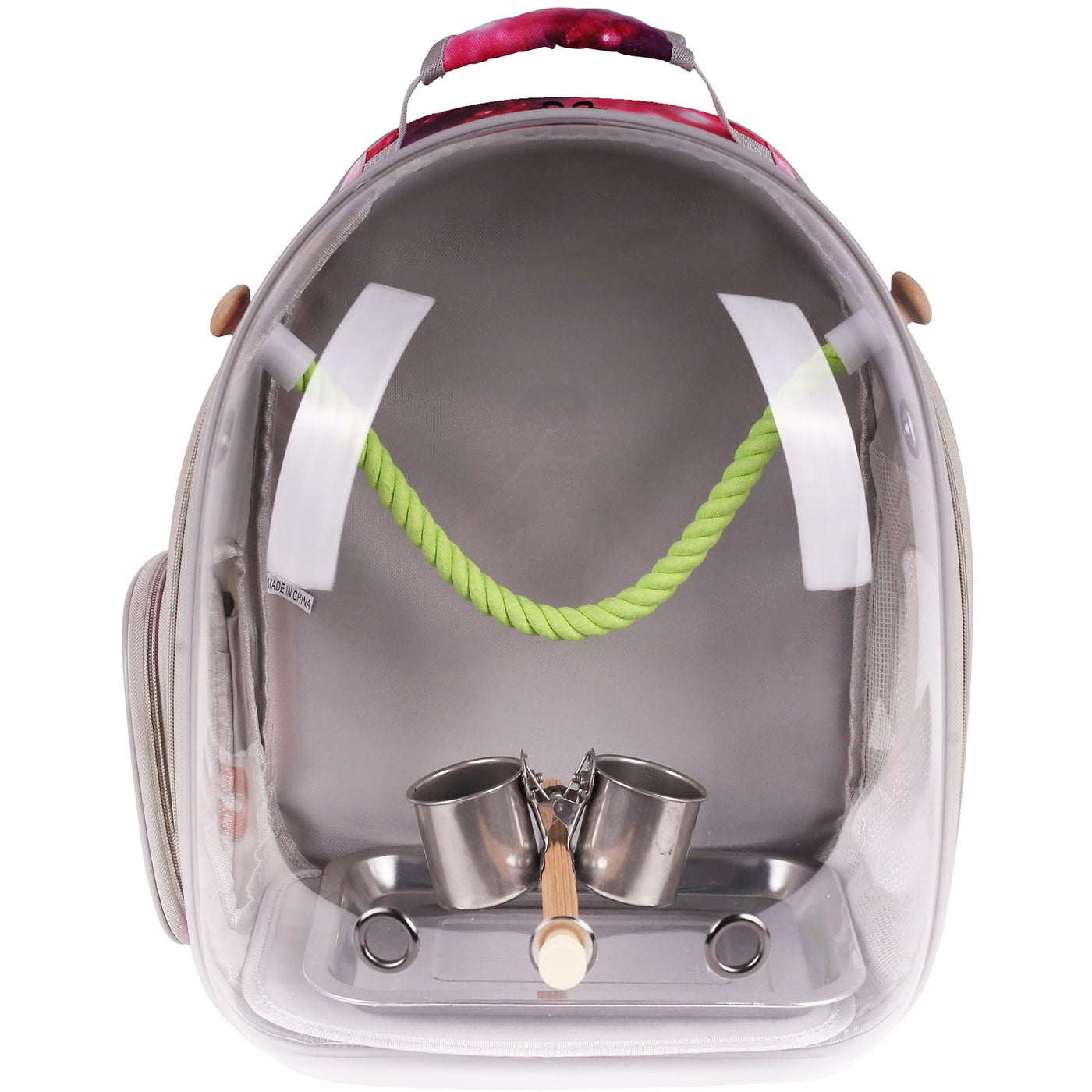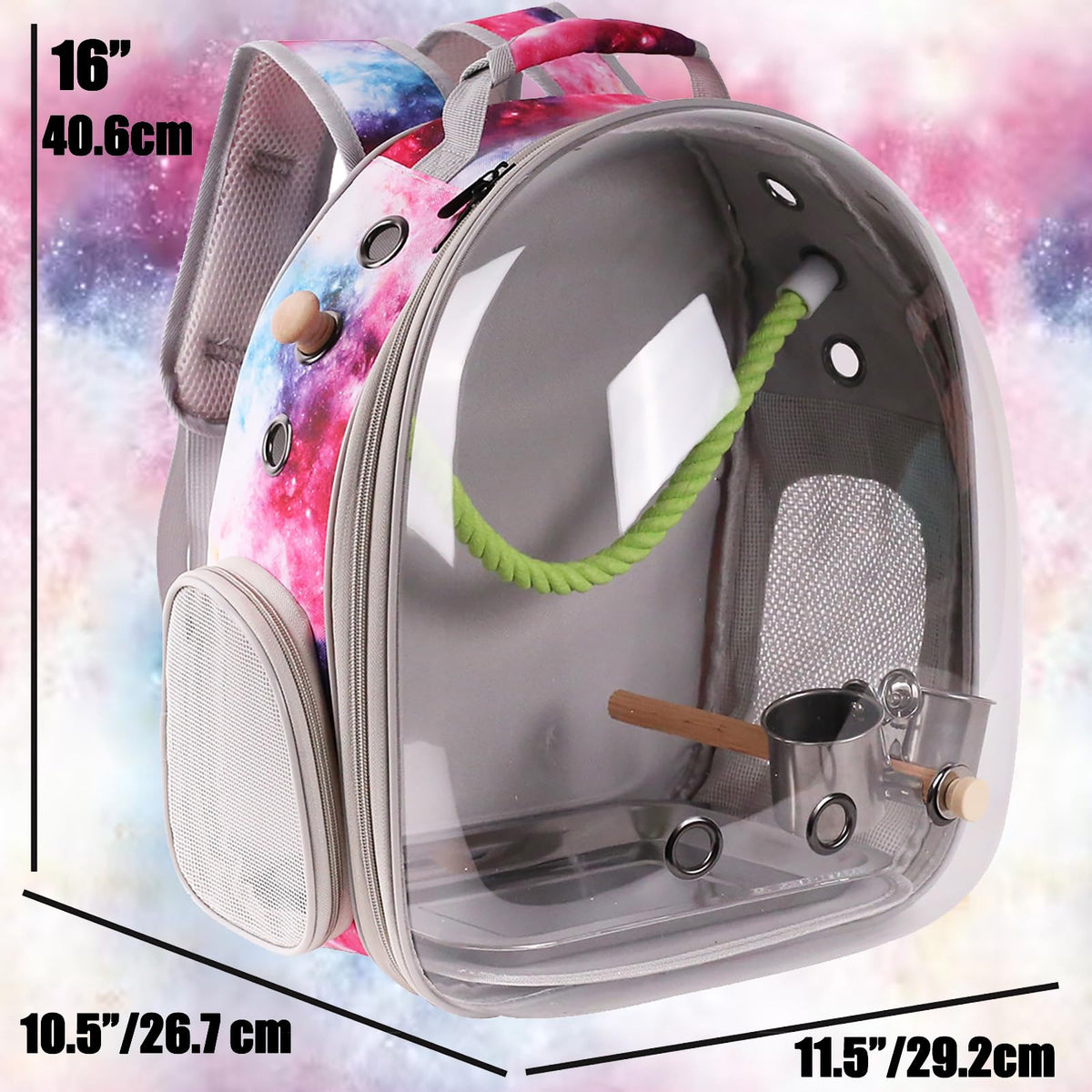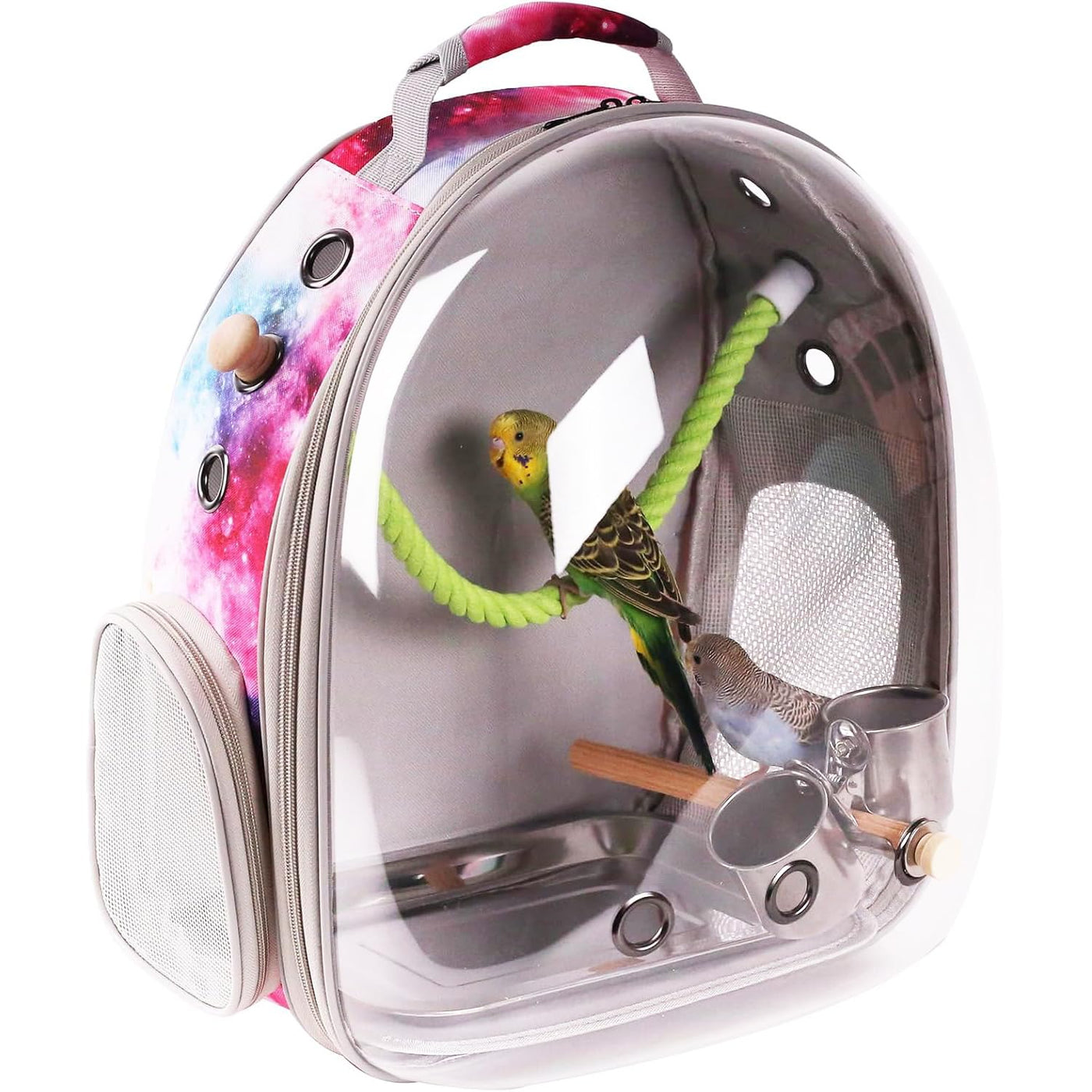 Features: ?Accessories: Pet Carrier Includes 1 X Backpack, 1 X Rope Stand Perch, 1 Clamped Cup, 1 X Metal Tray, 1 X Wooden Single Bar And 1 X Soft Mat For Replacement. All You Need For Traveling Is Adequate And Ready-To-Go. The Bird Backpack Is Proper For Most Of Small To Medium Size Of Bird Like Parakeet, Budgies, Parrot, Conure And Cockatiel. ?Color: The Unique Galaxy Blue Color Makes Your Bird Cage Stand Out Of Solid Color Small Pet Bag. ?Texture: Astronaut Clear Bubble Window Design Let Your Pet Enjoy The Sunshine And Scenery When Outdoor Adventure. ?Breathability: The Vent Holes And Mesh Design On The Side Of The Bird Carrier Provides Ample Ventilation. ? Wide Range Of Uses: Portable Bird Backpack: A Multi-Scenario ''Mobile Castle'' For Birds, Lightweight And Versatile, Redefining Pet Travel Experience. Whether Strolling In The Park At Dawn Or Exploring The Countryside On Weekends, Bird Carrier Travel Cage Becomes A ''Bond'' Between You And Your Bird, Turning Every Trip Into A Warm, Companionable Experience. ?Social Gatherings: At Pet Parties, The Bird Travel Carrier Design Lets You Showcase Your Bird While Keeping Hands Free For Interaction. ?Br> ?Pet Backpack Isn'T Just For Birds. After Take Out The Accessories, Small Animal Carrier Can Also Be Used For Cats, Small Animals, Guinea Pigs, Lizards, Hedgehogs, Squirrels, Bearded Dragons, Sugar Gliders, And Rabbits. Portable: Bird Carrier Backpack Carry In Front Chest, Alternatively On Your Shoulder And Back Like A Typical Backpack Carrying. Bird Travel Cage Also Easy To Fold And Store When You Do Not Need It. Bird Bubble Backpack Can Be Converted Into A Front-Chest Mode Via Adjustable Shoulder Straps, Placing Your Bird Within Eye Level. This Design Not Only Allows Real-Time Observation Of The Birds Condition But Also Provides A Sense Of Security In Outdoor Environments, Especially For Timid Parrots Or Mannikins.