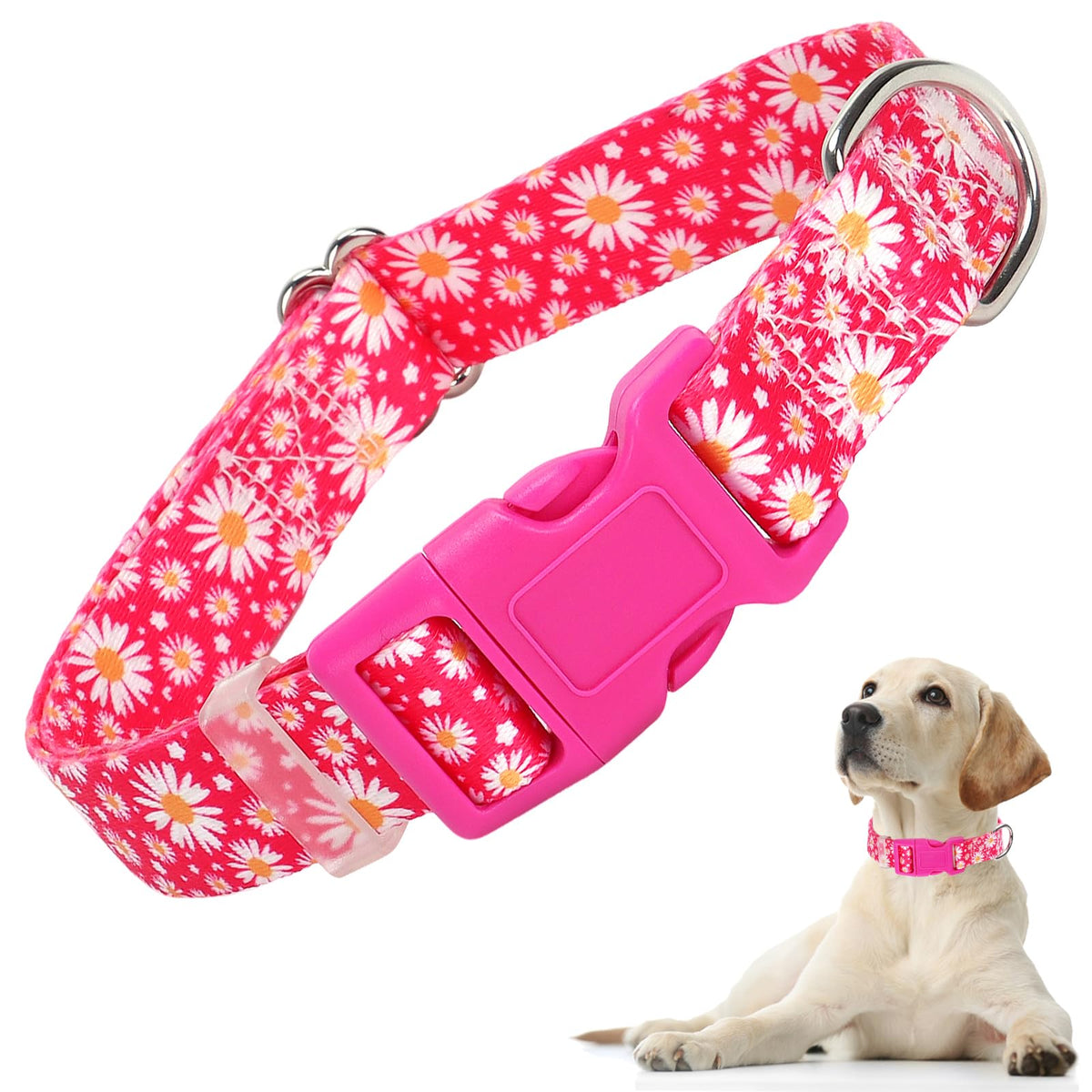 Pink Dog Collars For Medium Dogs, Cute Girl Hot Pink Daisy Dog Collar, Adjustable Nylon Comfy Soft Pet Collar With Quick-Release