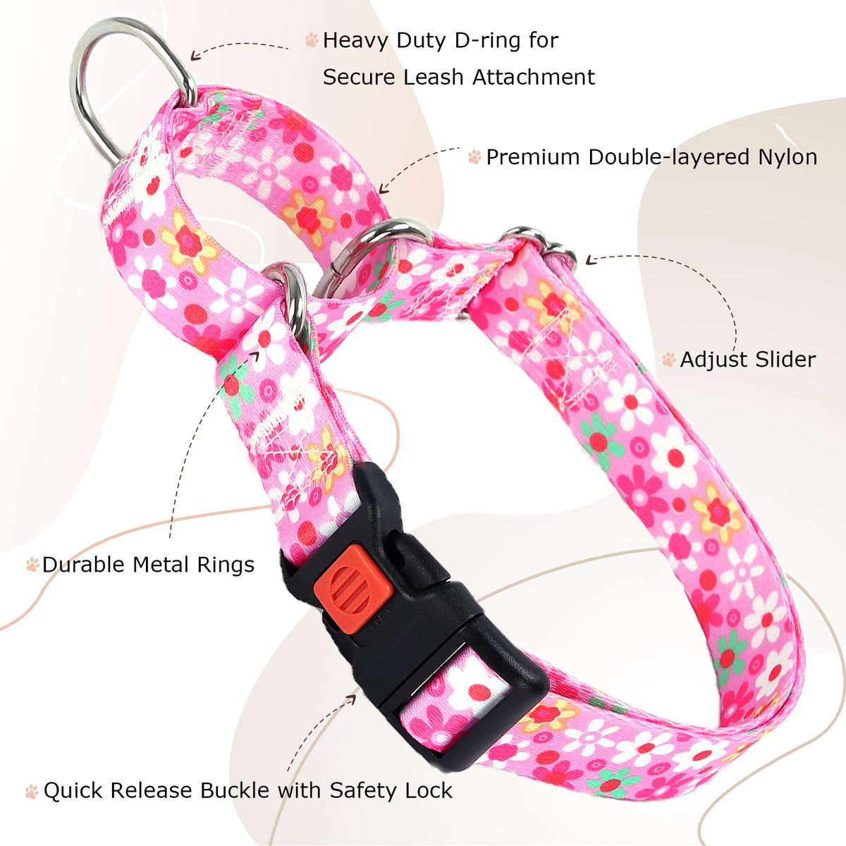Martingale Dog Collar'S Feature With Training Control Feature, Martingale Collar Is A Better Alternative To Standard Collar. The Dog Collars Are Made Of High-Density Nylon Webbing, Heavy Duty Hardware. Strict Pulling Test Conducted Before Production. Soft Webbing, Durable, Wear-Resisting And Hypoallergenic, This Dog Collar Would Not Hurt To Dog'S Skin. Metal D-Ring, Strong And Available For All Types Of Dog Leashes. Romantic Pink Color, Lovely Daisy Flowers, Make Your Dog More Charming.