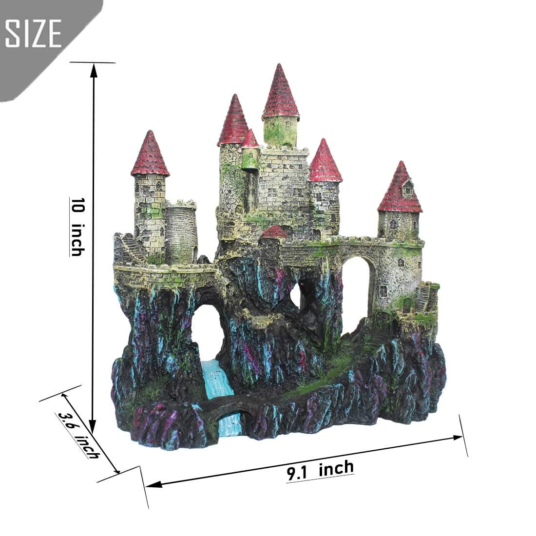 Q: What are the dimensions of the resin castle decoration?A: The dimensions of the PINVNBY Aquarium Resin Castle are approximately 9.1 inches in length, 3.6 inches in width, and 10 inches in height.