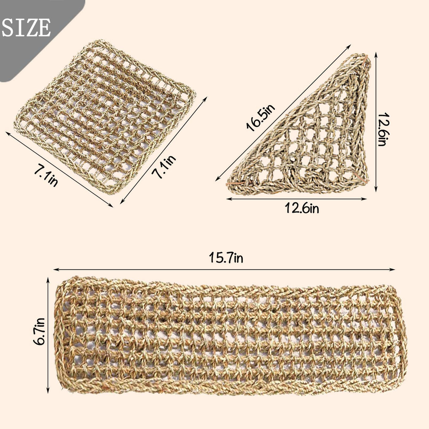 Q: What materials are used in the construction of the hammocks?A: The hammocks are made of 100% natural seagrass fiber, which is handwoven for durability and comfort. This high-quality material ensures a safe and enjoyable environment for your pets.