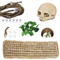 PINVNBY Bearded Dragon Tank Accessories Resin Human Skull Reptiles Habitat Seagrass Hammock Coconut Shell Hut Jungle Climber Bendable Vines Leaves Decorations for Lizards,Chameleon,Snake,Spider,Gecko Reptile flexible decor vine has a rough surface and it s easy for reptiles to climb on,comes with suction cups,easy to adjust and affix to the tank.The artificial leaves are PP laminated,not easy to discolor or fade.The bendable grape vine and the reptile leaves all have lifelike appearance,can blend well with other plants in the tank,help to create a natural environment for your pet. Specifications: Material:Resin Color:As Picture Size: Resin Humans Skull:5.5 x 4.3 x 3.9inches/14 x 11 x 11cm Lizard Hammock Bed:30 x 7.0 inches/75 x 18cm Coconut Shell Hut Diameter:5.11 inches Package includes: 1 x Resin Humans Skull 1 x Lizard Hammock Bed 1 x Natural Coconut Shell Cave 1 x Reptile Flexible Decor Vine 1 x Reptile leaves 10 x Suction Cups Resin Human Skull Cleaning Tips: Please soak for 10-15 minutes with water before applying wipe off the dust and paint smell. There is not need to clean the resin ornament too often,they won t die,rot or cause any algae problems. Note: Please allow 1-2cm error due to manual measurement,pls make sure you do not mind before you bid. Due to the difference between different monitors,the picture may not reflect the actual color of the product.Thank you!