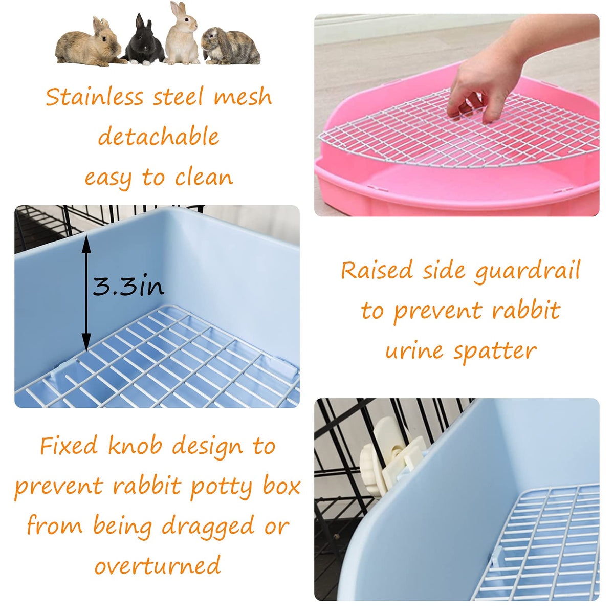 Humanized Design: The two sides of the bunny potty box is the smooth guardrail and the raised baffle can effectively prevent splashing, make the cage cleaner.Fixed knob to prevent potty pan overturned and litter scattered.