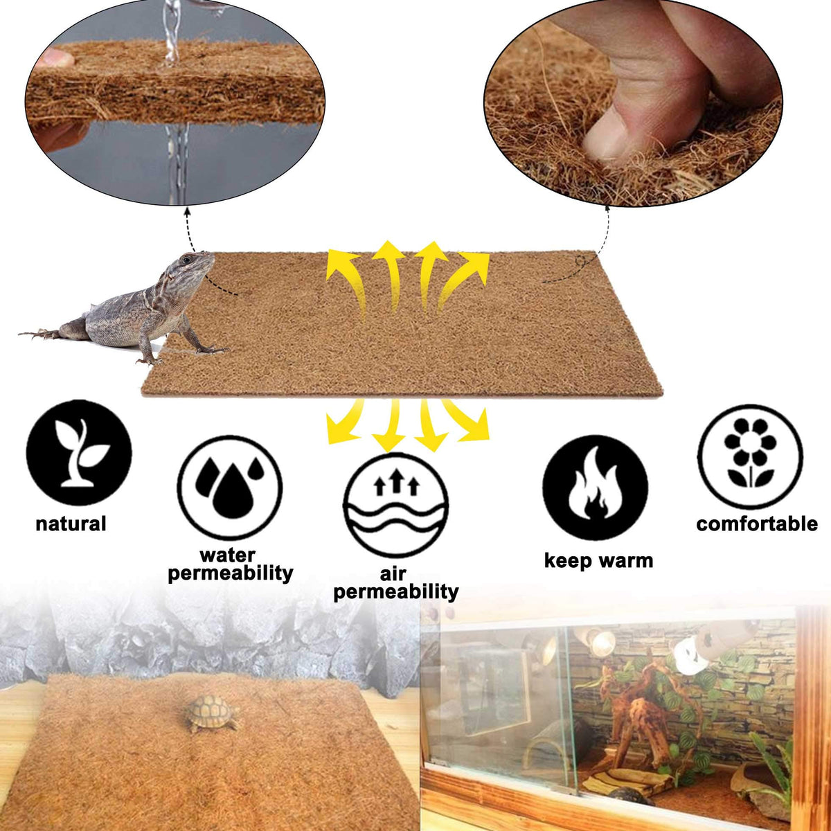 PINVNBY Reptile Carpet Lizard Natural Coconut Fiber Substrate Liner Pads Pet Plush Habitat Mat Terrarium Supplies for Bearded Dragon,Snake Bedding, Gecko,Tortoises,Tortoise and Chameleons (2 Sheets) The reptile carpet is made of natural high-quality coconut fiber and a non abrasive felt material,Non-toxic, tasteless and bacteria-free and eco-friendly material,Not easy to break or deform.without any other harmful ingredients so dont worry about your pets getting for for reptile feet, tripe and teeth. The reptile carpet are resistant to dirt, durable and easy to clean,moisture-proof and warm provide natural protection. It has strong filterability,strong water permeability and good air permeability and so on will not irritate reptiles for claws and skin.If you think reptile mat is too large,You can according terrarium bottom size,Please use scissors to cut the actual size and placed at will. Specifications: Color:As shown Material: Natural Coconut Fiber,Non Abrasive Felt Material Size: Reptile fiber carpet:19.7 x 11.8 x 0.4 inches / 50 x 30 x 1cm Soft green mat: 23.6 x 15.7 x 0.31 inches / 60 x 40 x 0.8cm Package including: 1 x Reptile Carpet 1 x Soft green mat Note: 1.Please allow 1-2cm error due to manual measurement. pls make sure you do not mind before you bid. 2.Due to the difference between different monitors, the picture may not reflect the actual color of the product. Thank you! 3.Please confirm the size before your ordering! If you have any questions please feel free to and we will give you a replacement or full refund and try our best to solve them with in 24 hour. Thank you for your purchase and support!