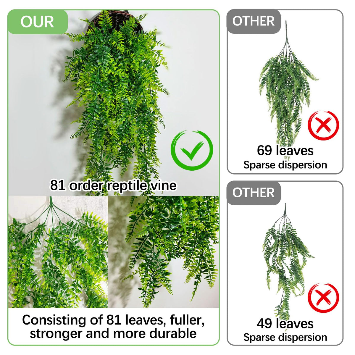 Q: What is the size of the plants included in the package?A: Each plant measures approximately 33 inches long. The package includes either 3 or 4 reptile decoration plants, each equipped with 2 suction cups for easy attachment.