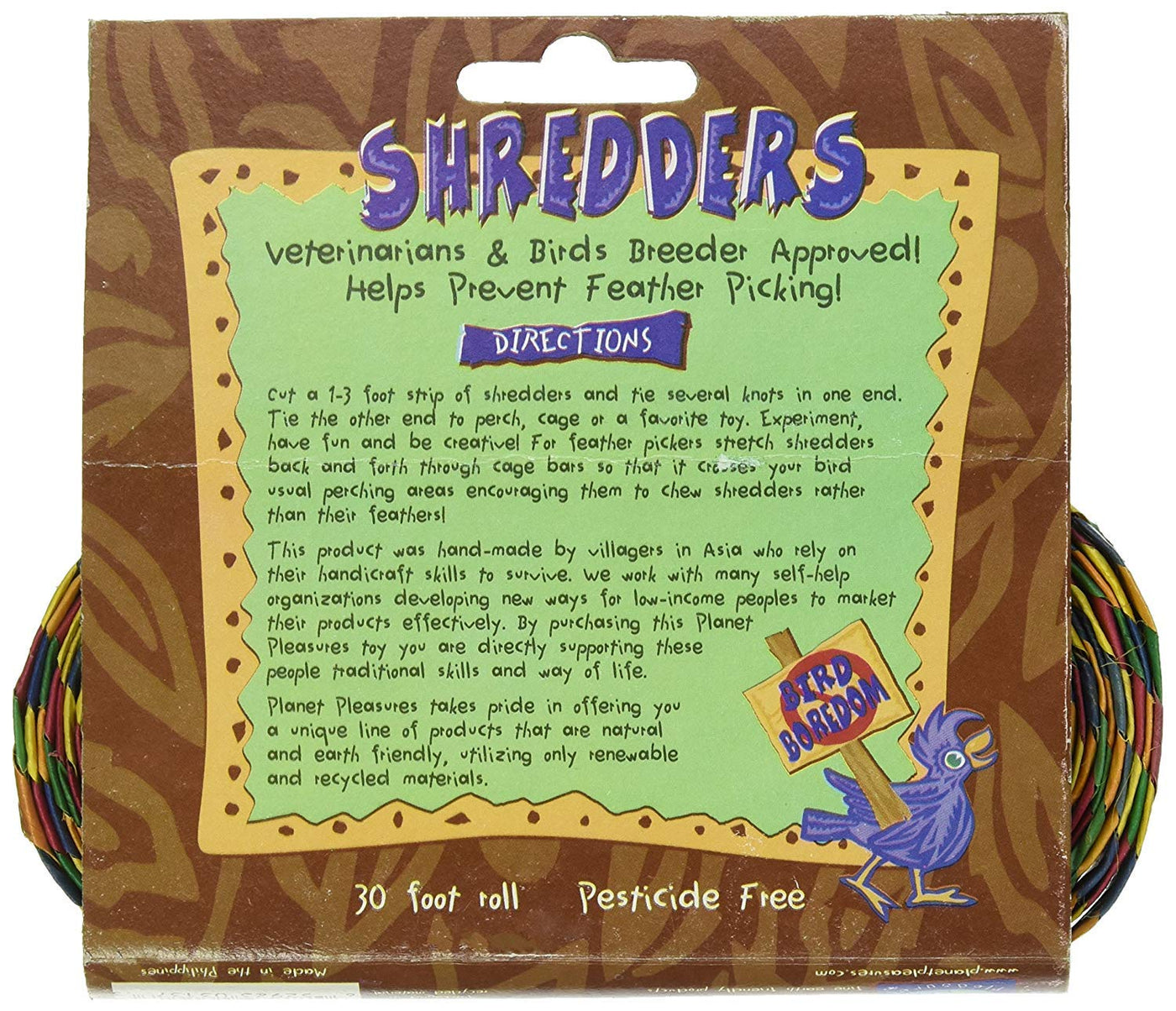 Planet Pleasures Rainbow Shredders is the new, fun-colored version of the beloved classic! Rainbow Shredders alleviates boredom by encouraging chewing. All natural palm leaf material is and easy to chew for any size bird. Rainbow Shredders can be tied to mostly anything in your bird's cage, leaving options for use wide open. Planet Pleasures produces stimulating toys made from and sustaining materials that are Fair Trade manufactured.