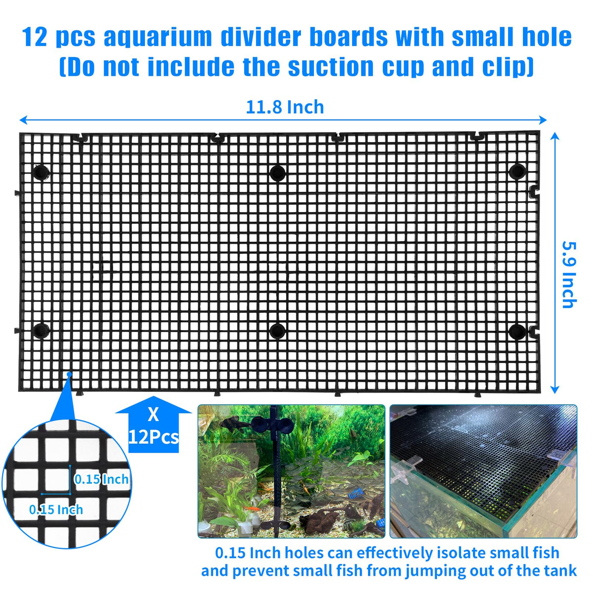 ?Product size?aquarium divider separator kit includes 12pcs black aquarium divider and fish tank divider board size is 11.8 Inch X 5 .9 Inch with 0.15Inch hole