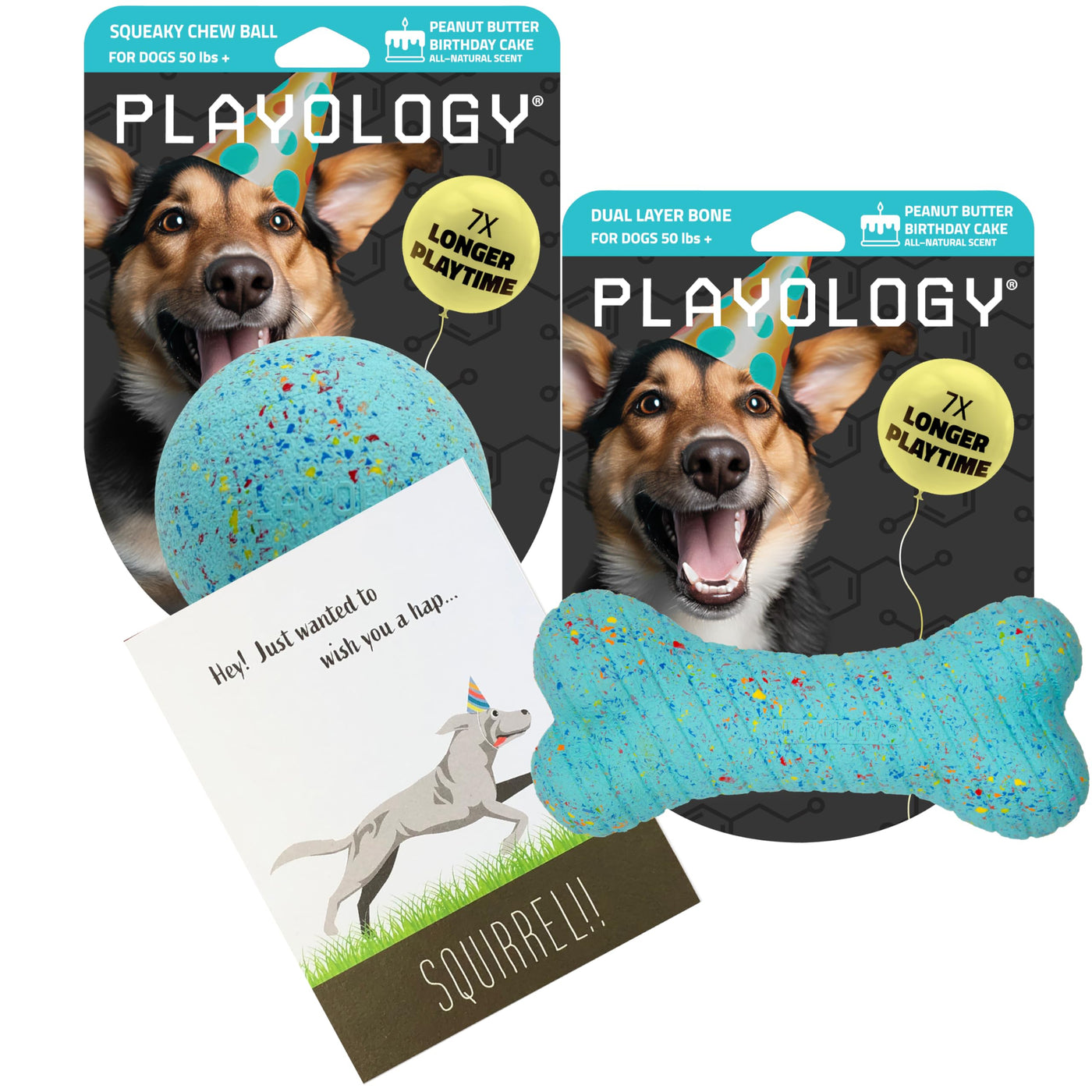 Playology Birthday Pack Dog Toys For Large Dogs | All-Natural Peanut Butter Birthday Cake Scented Gift Bundle | 1 Squeaky Chew B