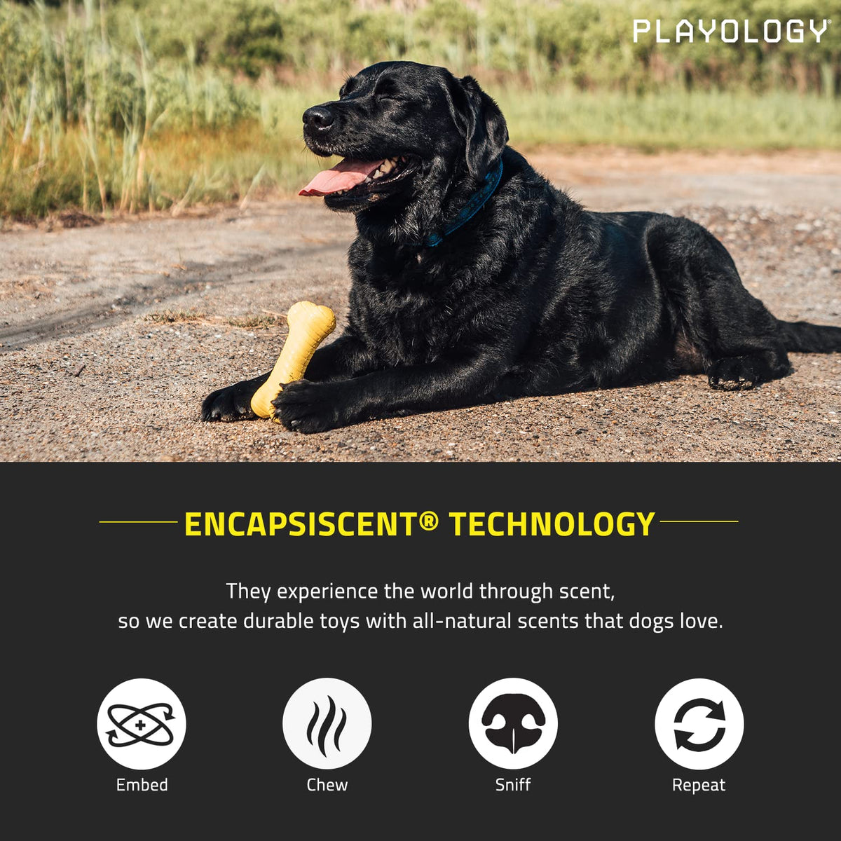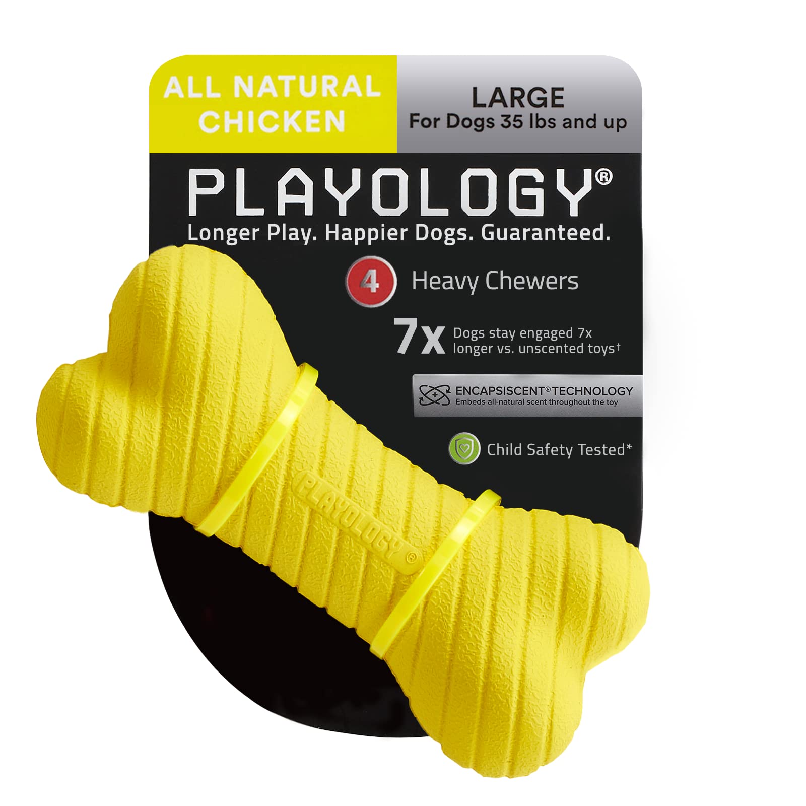 Playology s Dual Layer Bone is a dog bone-shaped protein-scented chewable toy for dogs. It is ideal for moderate to heavy chewing dogs and its non-toxic BPA-, phthalate- and lead-free extra-durable rubber is sheathed in slobber wicking performance material, which rinses clean in warm water. Featuring 100% all-natural made-in-the-USA protein scent embedded throughout its material, Dual Layer Bone helps create vigorous exercise-based play by triggering dogs instinctive desire for food via their powerful olfactory organs and nerves. Pet owners, professional dog handlers, veterinarians and service dog trainers utilize this interactive dog toy to help canines stay alert, in shape, and always ready for lively physical exertion. Playology s 100% Happiness Promise: If you or your dog aren t satisfied with your purchase, we ll make both of you happy with either a replacement toy or a full refund. About: Dog lovers Adam and Lendy Beatty founded Playology to make dogs as fit and happy as possible. Studying the science behind what truly motivates canines, our dedicated team designed a colorful array of chew toys to stimulate dogs dynamic sense of smell, which is roughly 10,000 times more powerful than ours. Trademarked Encapsiscent Technology, Playology scientists encapsulate millions of microscopic protein derivatives throughout the whole toy, which excite dogs into chewing, gnawing, and fetching their way toward a stronger physique without unhealthy snacks. Inspiring highly-enthusiastic states of vigorous hunger-based cardiovascular exercise, all of our non-toxic dog toys can help pets stay healthy throughout their entire lives.