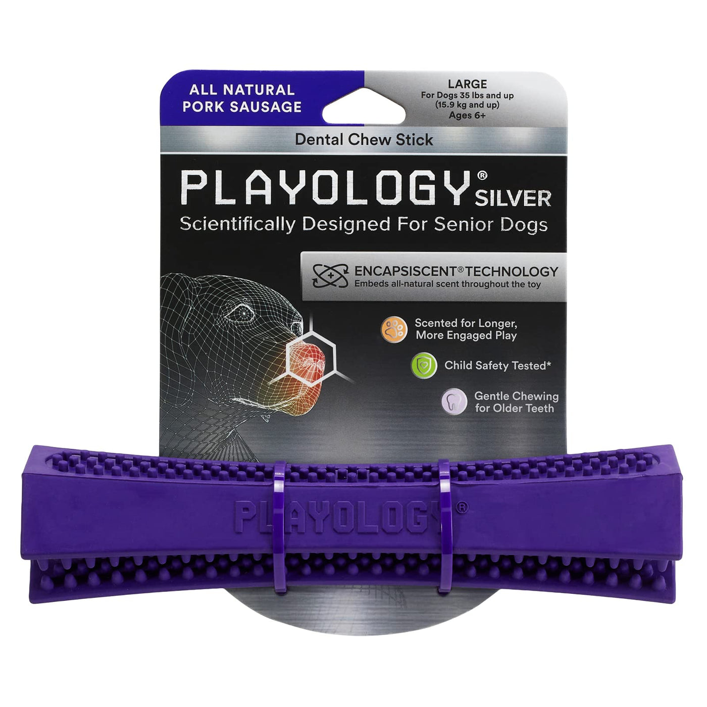 Playology Silver Dental Chew Stick Dog Toy, Large - Designed for Senior Dogs (35lbs and Up) - Engaging All-Natural Pork Sausage