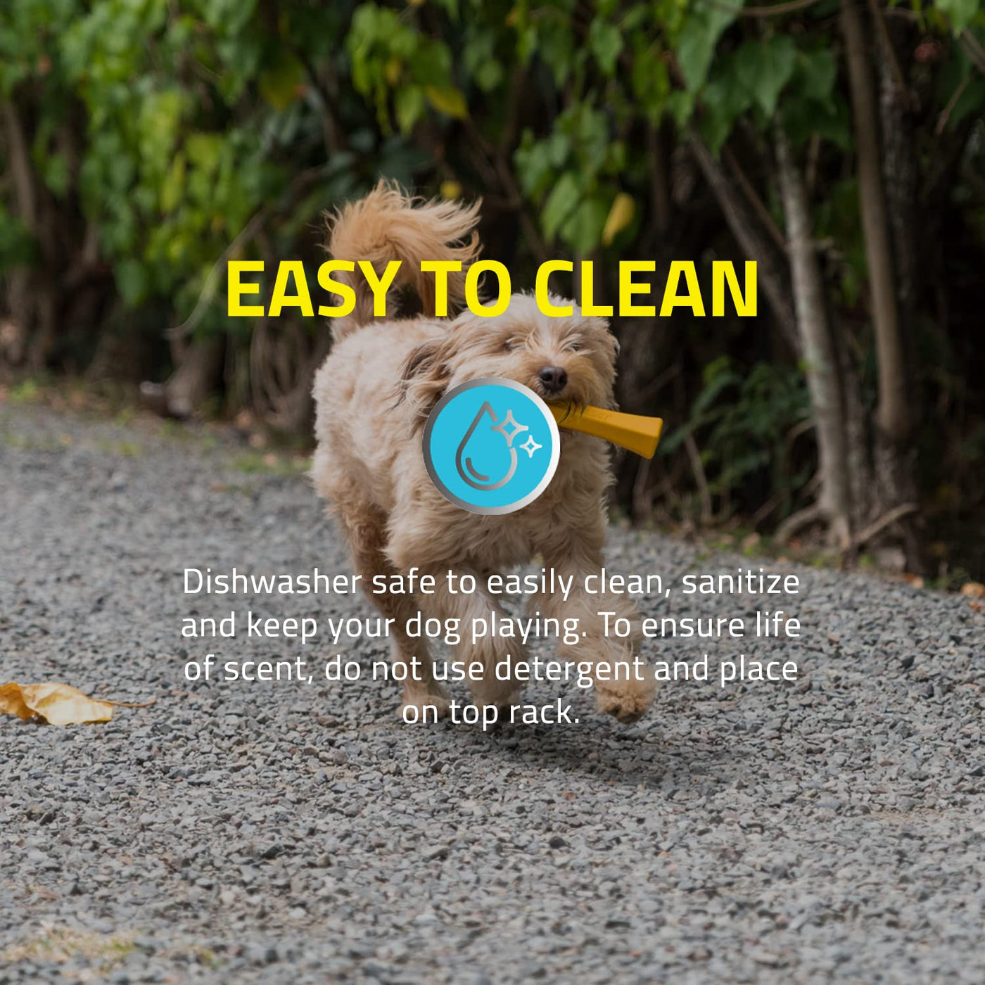 Q: How do I clean the Squeaky Chew Stick?A: Cleaning the Playology Squeaky Chew Stick is easy. Simply rinse it with warm water and pat it dry. The toy's design helps prevent dirt and sand from getting trapped, ensuring it stays clean and safe for your dog.