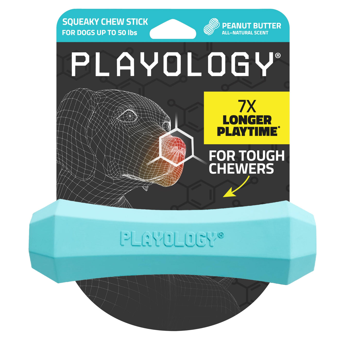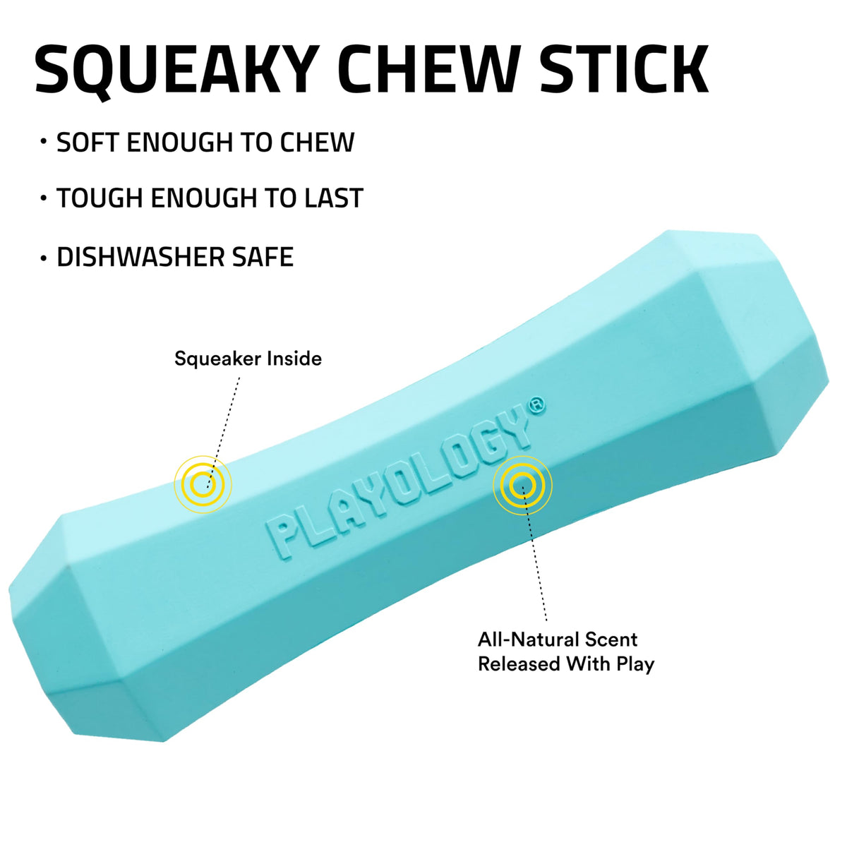 Q: What makes the Playology Squeaky Chew Stick different from other dog toys?A: This toy features Encapsiscent Technology, which embeds all-natural scents like Peanut Butter at a microscopic level, keeping your dog engaged longer than typical unscented toys.