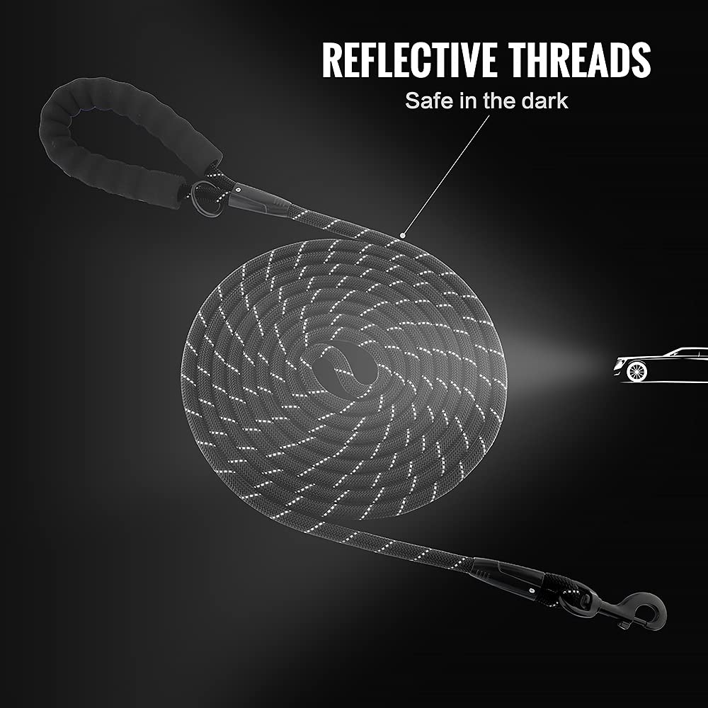 The Plutus Pet long rope dog leash is designed as a better choice for you and your four-legged friend. The rope dog leash is made of mountain climbing rope. It's very duty and sturdy, meanwhile very light-weighted and soft. The padded foam will provide perfect comfort during dog activities. The sturdy metal O-ring allows an easy attachment of a poop bag. We also provide a reflective thread to ensure safety during a night walk.
