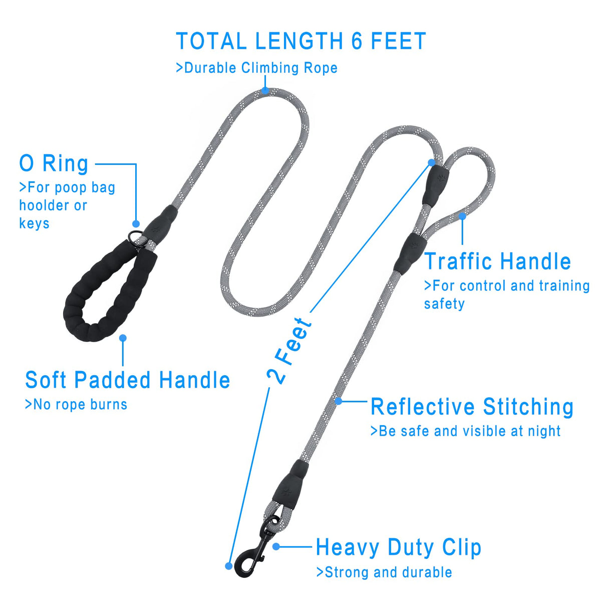 Are You Concerned About Your Dogs Safety When Youre Out?Are You Need A Better Control Leash For Busy Sidewalks?Stop Searching, We Have What You Need: The Plutus Pet Double Handle Dog Leash.Our Rope Dog Leash Features 2 Handles, One At The End Of The Leash At 6 Feet And Another At 2 Feet From The Clip. The Longer One Is Perfect For Casual Walks, Extended Sniffing And Loose Leash Walking, The Shorter One Is Great For Busy Sidewalks, Bike Paths And Crowded Areas That Requires Instant, Up-Close Control Of Your Dog. Can Be Used As A Training Aid To Control Dominance And Aggression.The Leash Has Soft Foam Padded Handles, Which Are Much More Comfortable Than Normal Leash Handles And Will Prevent Redness, Chafing, Or Blistering On Your Hands.Reflective Stitching Maintains High Visibility At Night For Safety.Why Youll Love It!Great Control Of Your Dog In Both Busy And Less Crowded Areasextra Padding On Handles Adds Comfortreflective Stitching For Safetymade Of Strong 1/2 Inch Diameter Rock Climbing Rope And Durable Metal Cliplarger Clasp For Safety