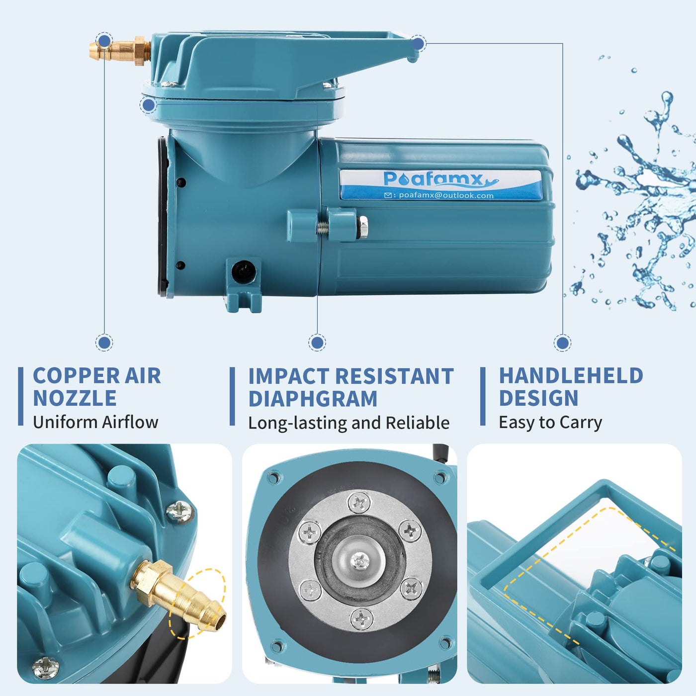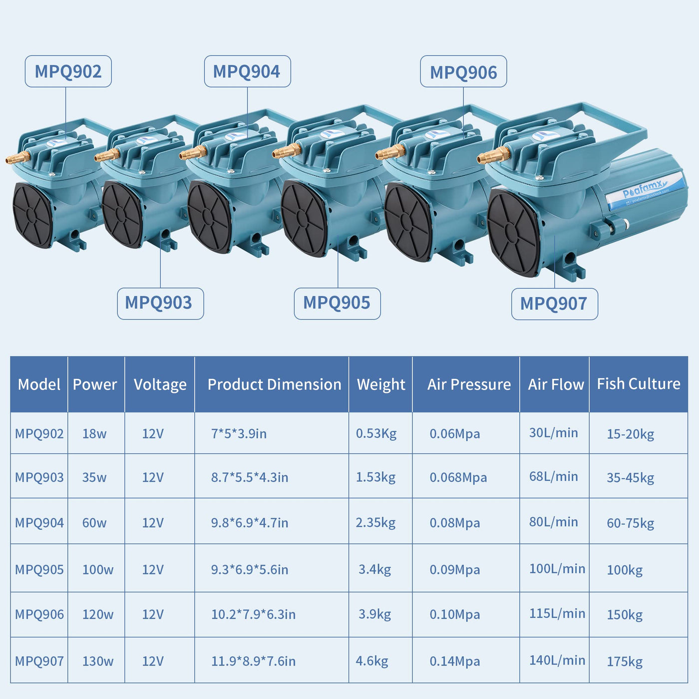 Poafamx DC 12V Pond oxygenation pump: 1.Low power consumption High efficiency. 2.Powerful air volume and high pressure fit the deep water. 3.Wider application for outdoor fishing, aquatic transportation, only need to connect to the corresponding battery can be used.