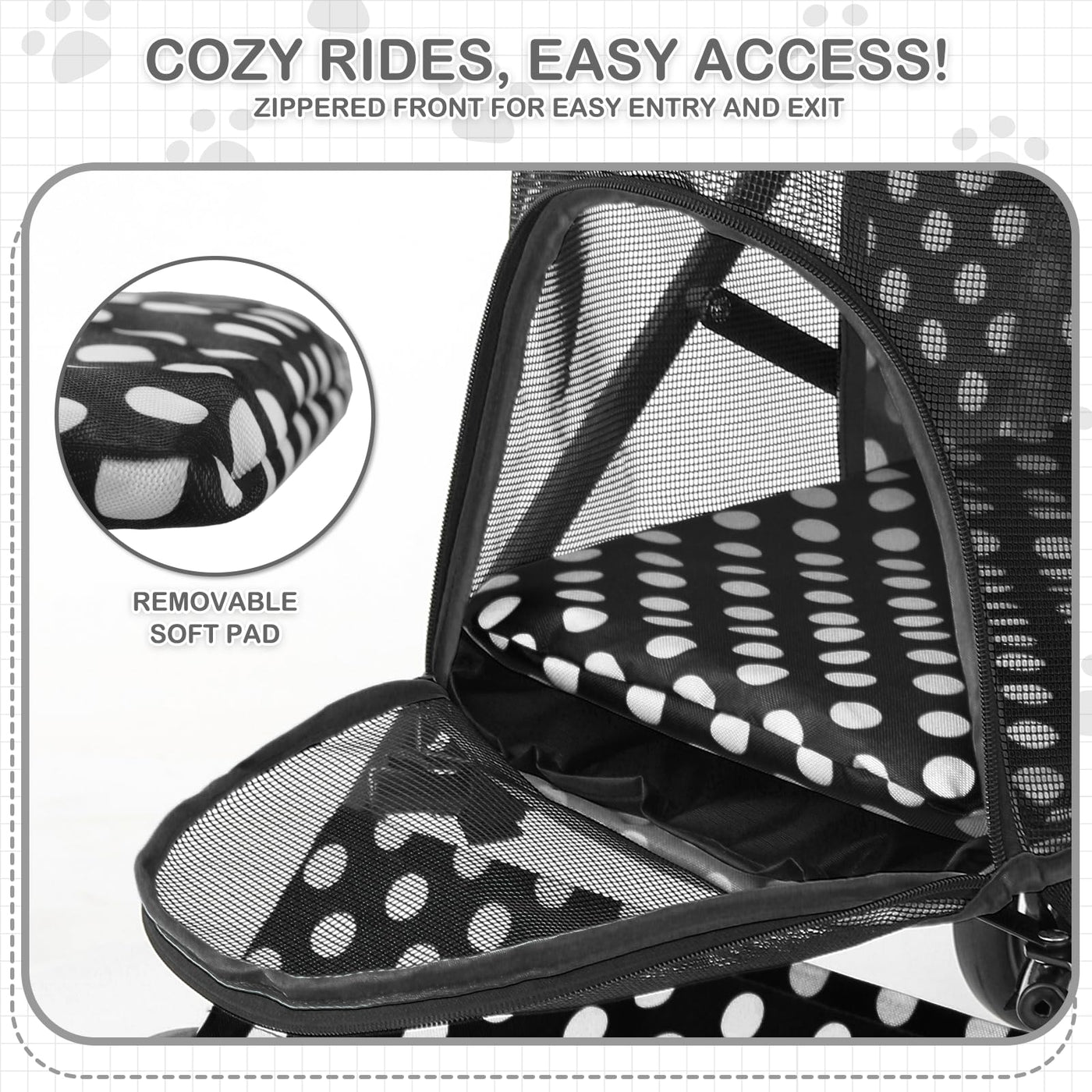 The Polias Dog Stroller In Charming Hot Pink Polka Dots Combines Style And Practicality For Small And Medium Dogs Or Cats. Designed For Convenience, This Easy-Fold Pet Stroller Collapses Into An Umbrella Shape For Compact Storage And Portability. The 4-Wheel Dog Stroller Ensures Smooth, Stable Rides On Sidewalks, Parks, Or Uneven Terrain, Offering Versatility For Daily Outings.With Visible Mesh Windows, This Stroller For Small Dogs Provides Excellent Ventilation While Keeping Your Pet Secure. A Spacious Storage Bag Accommodates Essentials Like Treats, Leashes, Or Toys, Making It Perfect For Errands Or Travel. Lightweight Yet Durable, This Pet Stroller For Dogs And Cats Guarantees Comfort And Reliability For Your Furry Companion.