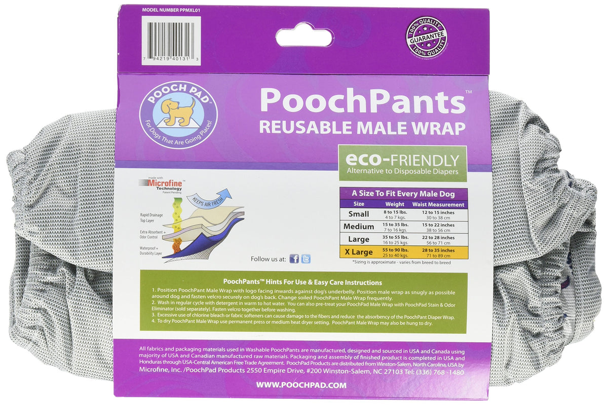 Pooch Pants Male Diaper Wraps are an innovative dog diaper that combines the absorbency and odor controlling properties of Pooch Pads into a comfortable and easily managed diaper construction. Pooch Pants Male Diaper Wraps require no inserts and are completely washable and reusable (Guaranteed for 300 washes!). Each Pooch Pants contains Micro fine fiber technology to control odors. Male wraps are available in four sizes to fit most Pooches (Small to X-Large).