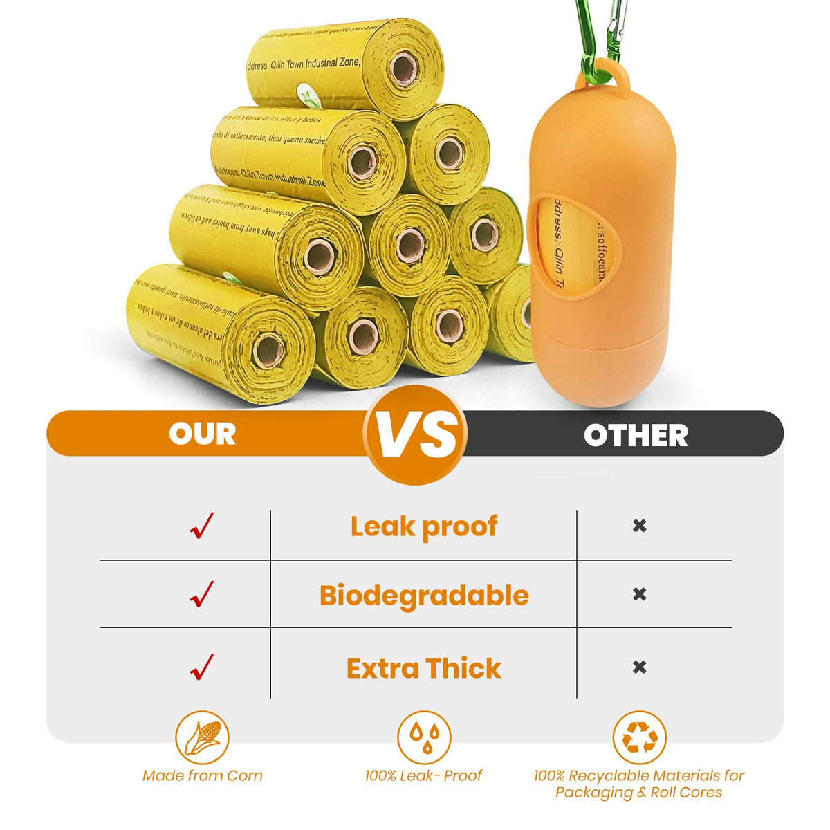 Biodegradable dog poop bags, extra thick and durable, easy to open and 100% leakproof, our dog poop bags rolls is necessary for dog working, because they are eco friendly