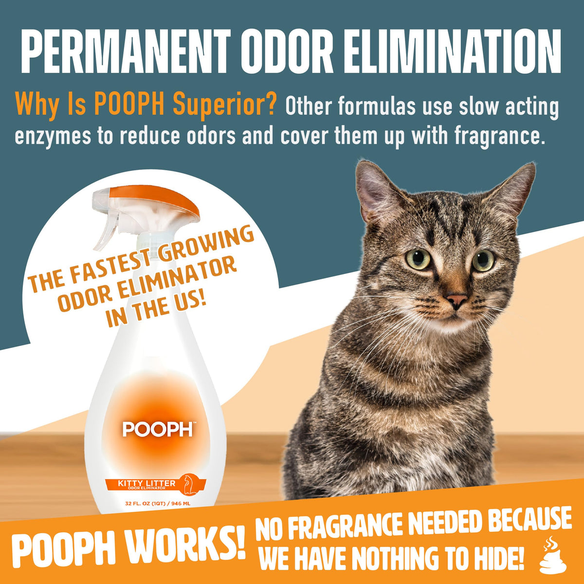 POOPH takes “stink” out of the equation – completely and permanently dismantling and removing odors on a molecular level. Unlike enzymatic formulas that work slowly and leave odors behind, POOPH works instantly to eliminate odors at the source – so there is no stink OR fragrance... when you use POOPH, it's as if the odor was never there! And as amazingly powerful as it is, Pooph is safe for people, pets and the planet! POOPH utilizes patented technology consisting of a proprietary blend of micronutrients essential to life. Rather than covering up litter box odors with artificial fragrance, eliminate them at the source with POOPH Kitty Litter Deodorizer. POOPH Kitty Litter Deodorizer instantly dismantles odors on contact and can be used on any type of litter.