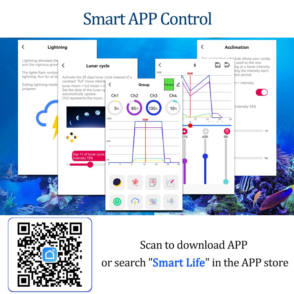 【High-performance LED Lighting】RS90 are the PopBloom newest and most popular version light in market, which is scientifically engineered to keep the balance of the PAR output and coverage. Both the brightness and PAR are perfect. 【Natural Simulation】 with one smart controller, it can simulate natural sunrise_set, 4 seasons, 24hrs day_night cycle, lunar cycle. 【Programmable Usage Modes】The DIY mode covers 24 hours, the start time, end time and light color & brightness of each channel can be set freely according to your preferences. 【Best Spectrum】Perfect blue/uv pop bloom color, suitable for all photosynthetic corals. acclimate your tank or new corals to the new light by using the 'Slow acclimation' mode.【Daisy Chain】All lamps would be programmed by 1 smart controller at the same time. Easy to use and does not need to be adjusted one by one.