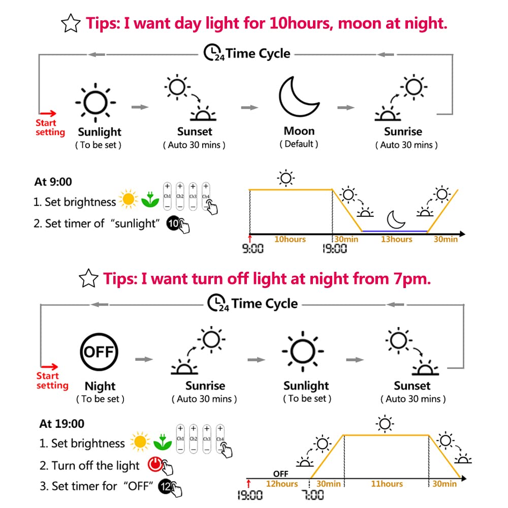 Design : 1>High Power & Full Spectrum: best for FRESHWATER tank 2>6 auto preset mode: meet variety of application scenarios 3>Moon time setting: open or close light in the night. 4>Time offset: let the light to match your rest time 5>Best Cover: NO SHADOW IN TANK