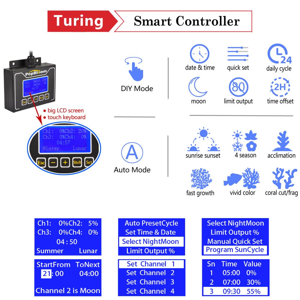 Smart Controller : Dimensions: 4.4” x 3” x 1.2” Screen size: 2.1” x 1.2” (mm) Channel numbers: 4 . Lighting From 1% to 100% Preset mode:four season,slow acclimate,vivi color,coral cut,reduce glgae,rapid growth Program mode: 8 time-points with auto ramp up and down for each channel