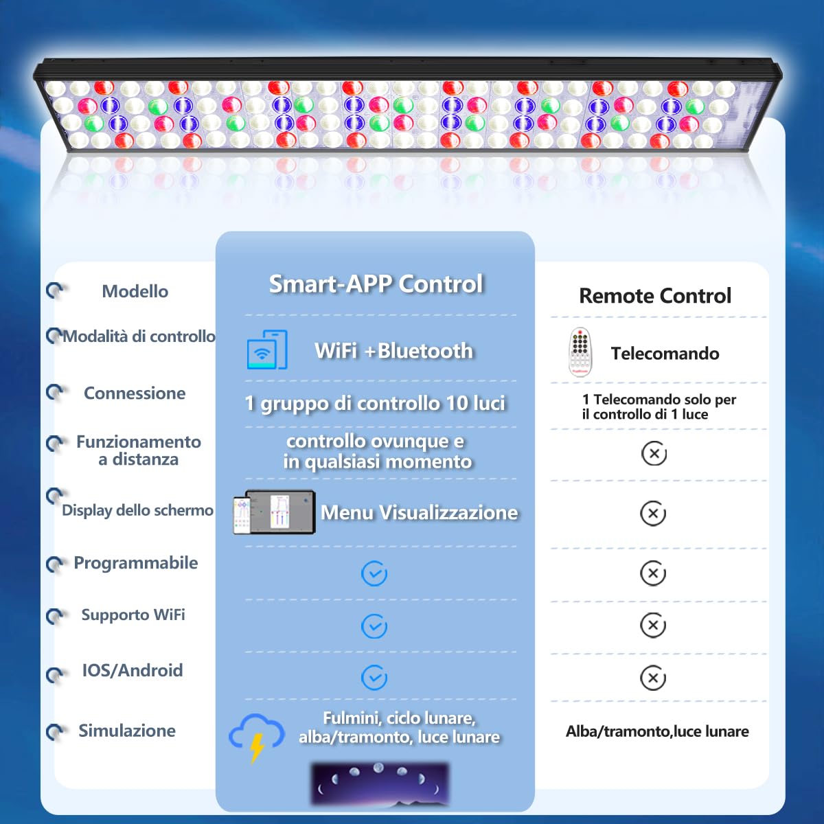 Q: How does the smart controller enhance the light's functionality?A: The smart controller allows for precise control of lighting with features like 6 auto preset modes, moon time settings, and programming for 8 time-points, ensuring optimal light conditions for your aquatic environment.
