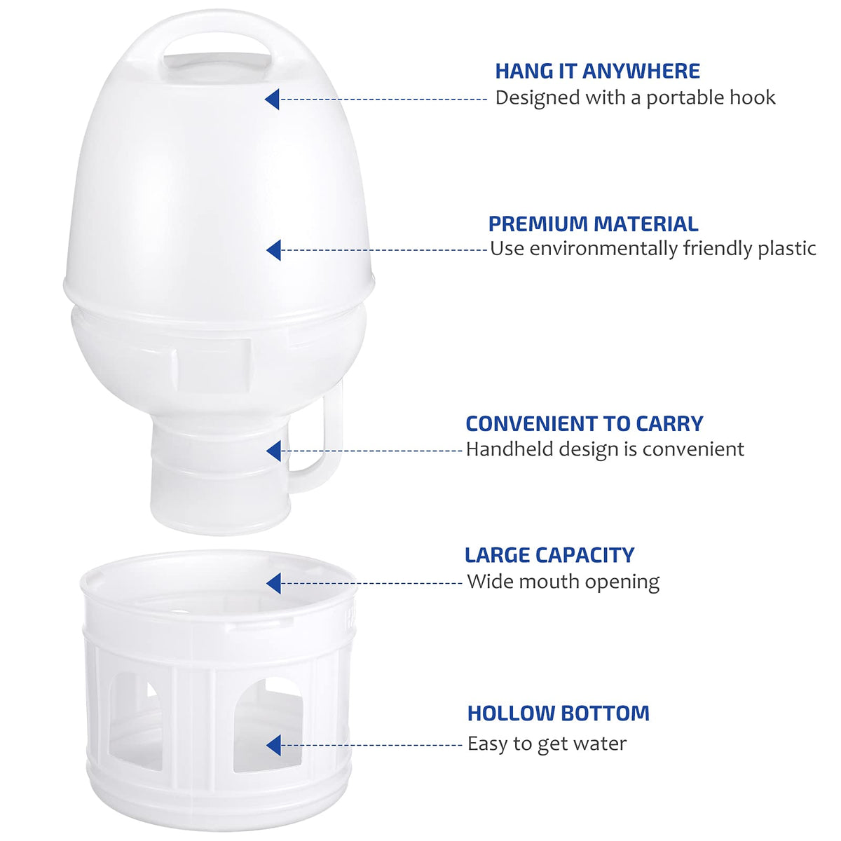 Q: What materials are used in the construction of the pigeon water dispenser?A: The POPETPOP Pigeon Water Dispenser is made from quality plastic that is durable and designed to withstand various weather conditions. This ensures long-lasting use without cracking or fading, making it perfect for outdoor settings.