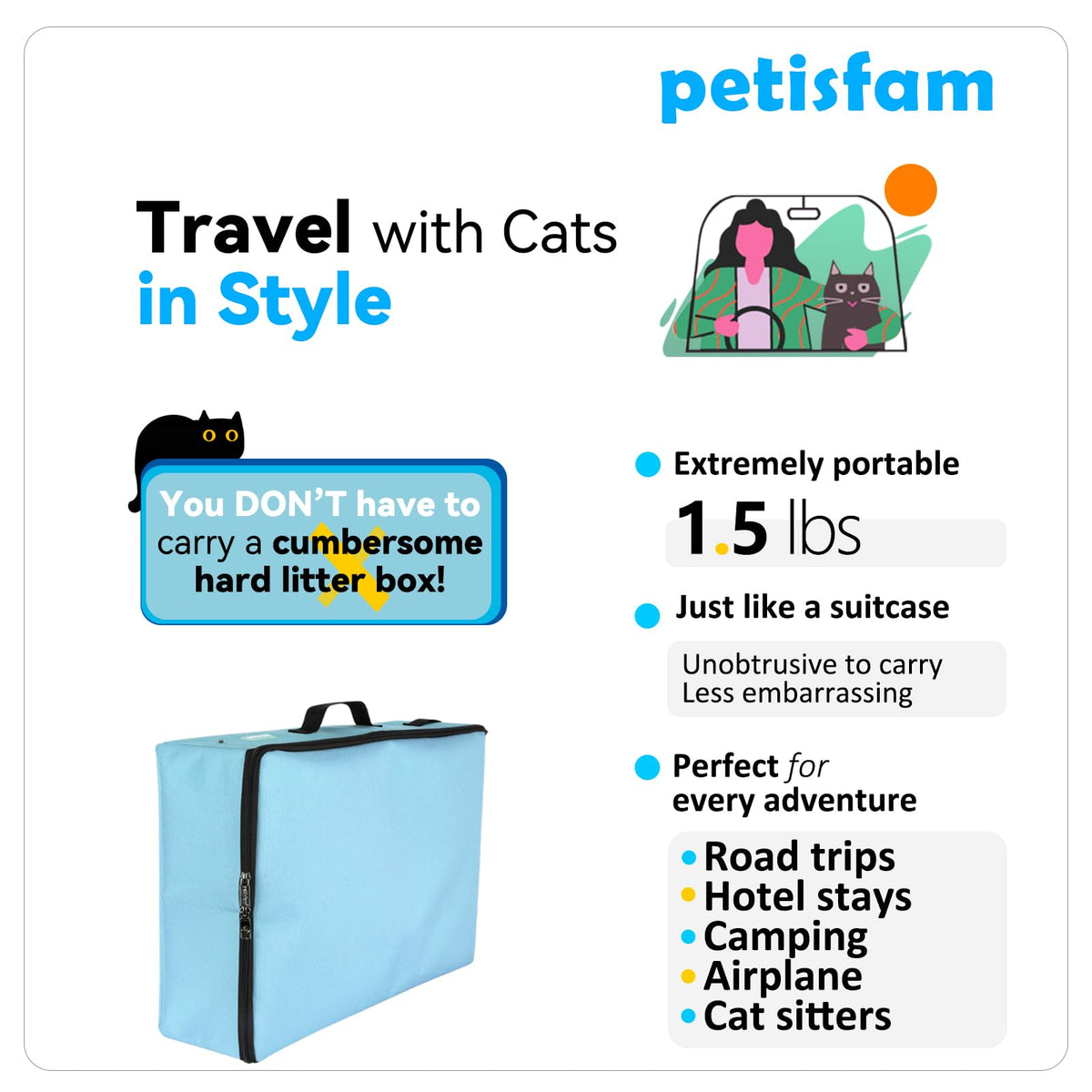 What Makes Petisfam Different?Pet Is Family.- Its Exactly That Focus Led Us To Make The Comprehensive Pet Product Range.- Created By Pet Loving Designers With Support From Trained Veterinarians.The Petisfam Collapsible Litter Box Offers An Easy Way To Accommodate Your Cats Bathroom Needs And Gives Great Convenience To You When You Are Traveling With Your Cats.- More Lightweight Than A Plastic Litter Box, Easily Carry It To Anywhere. And A Handy Handle Included, Easy To Carry It By Single Hand- No Leaks And Odor! Closed With A Zipper Closure At The Top That Keeps The Litter In And Also Keeps Most Of The Smell Contained- No Dirty Work If You Line The Box With A Plastic Bag, Just Throw The Plastic Away When You Arrive At The Destination- Reusable, Greener Than The Disposable Litter Box. Just Wash It After Each Trip- Sturdy But Flexible, You Can Use It Anywhere- Easy To Store, Folds Flat When Not In Use.- It Can Also Double As A Travel Bag To Store Things Like Treats, Toys, Blanket, Etc, Or As A Bed For Your Cat When They Need A Small Space To Call Home.Tips- Please Fill It With Enough Litter So Your Fuzz Baby Has Enough To Bury Their Business Properly.- Please Make Sure It Is Zipped Up Completely Before Carrying It.Unsatisfied, Damaged, Or Missing Part? Call Us 1-866-216-1072 - Free To Return The Item For Any Reason And Get A Full Refund- Free To Replace A New Item- Free To Exchange For A Different Size Or Color