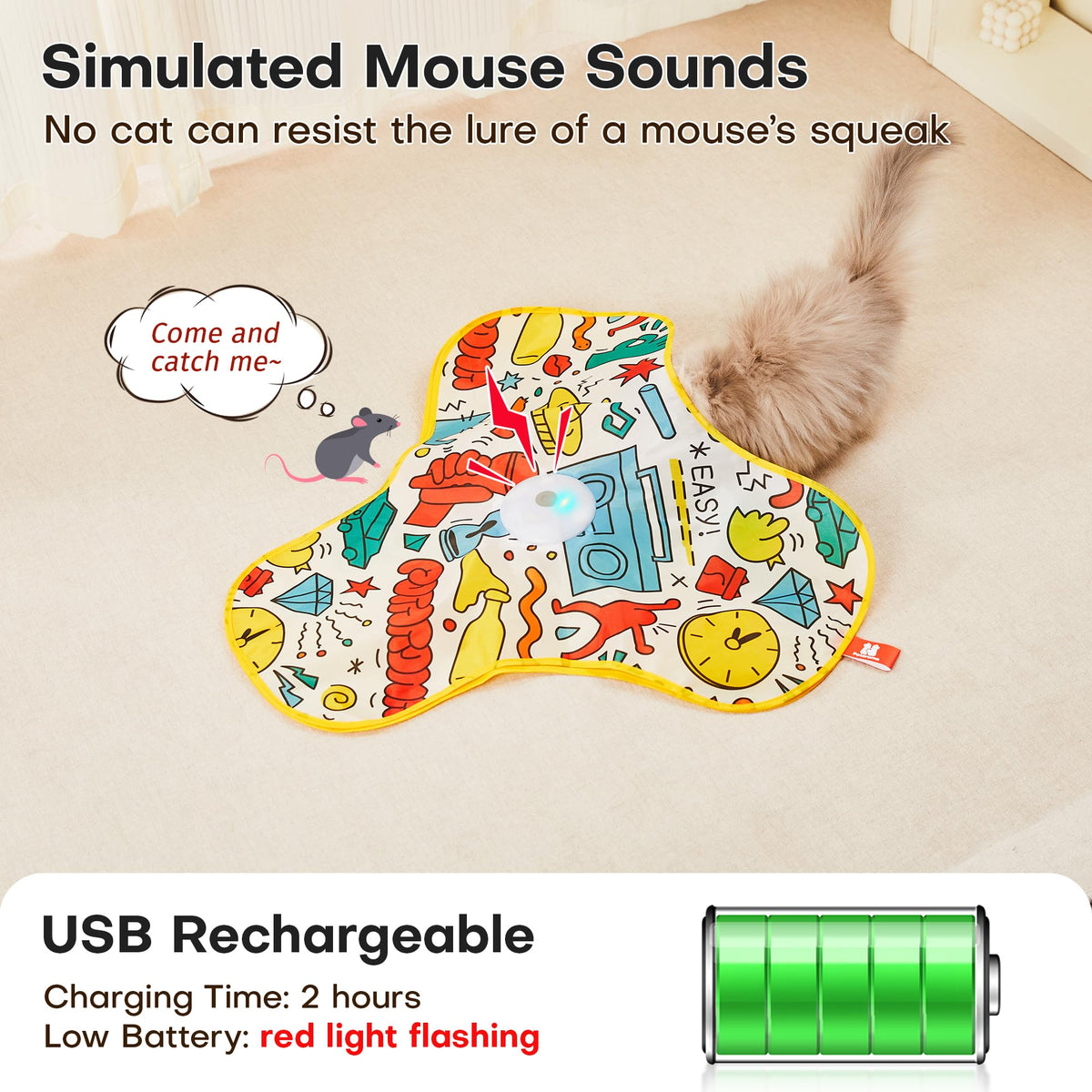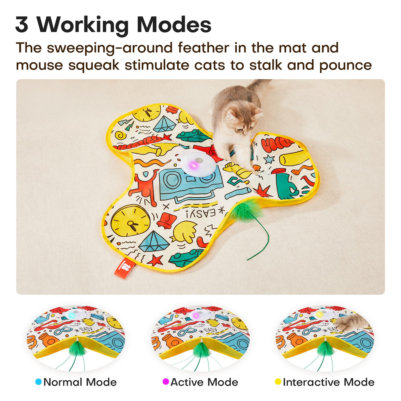 Interactive Hide & Seek Game Play - This Automatic Cat Toy Brings Excitement To Indoor Cats, Stimulating Their Hunting Instincts With A Moving Feather That Appears And Disappears In The Cover. The Random Motion, Combined With The Lure Of Feather Chasing, Keeps Your Kitty Entertained, Exercising, And Engaged In Funny, Stimulating Games, Perfect For Kittens And Adult Cats Alike. Smart Motion Sensor & Three Modes - Equipped With Intelligent Touch Activation, This Electronic Toy Allows Your Cat To Self-Play By Simply Touching The Toy. Choose From Three Adjustable Modes: Normal, Active, And Interactive, Keeping Your Cat Energized And Reducing Boredom For Hours Of Indoor Fun And Enrichment. Realistic Mouse Sounds For Enhanced Play - The Built-In Speaker Mimics A Mouses Squeak, Triggering Your Kitty'S Natural Hunting Instincts. Combined With The Unpredictable Feather Movements, This Toy Creates An Irresistible Game Of Seek And Chase, Keeping Your Cats Entertained And Mentally Stimulated Even When They Are Playing Alone.