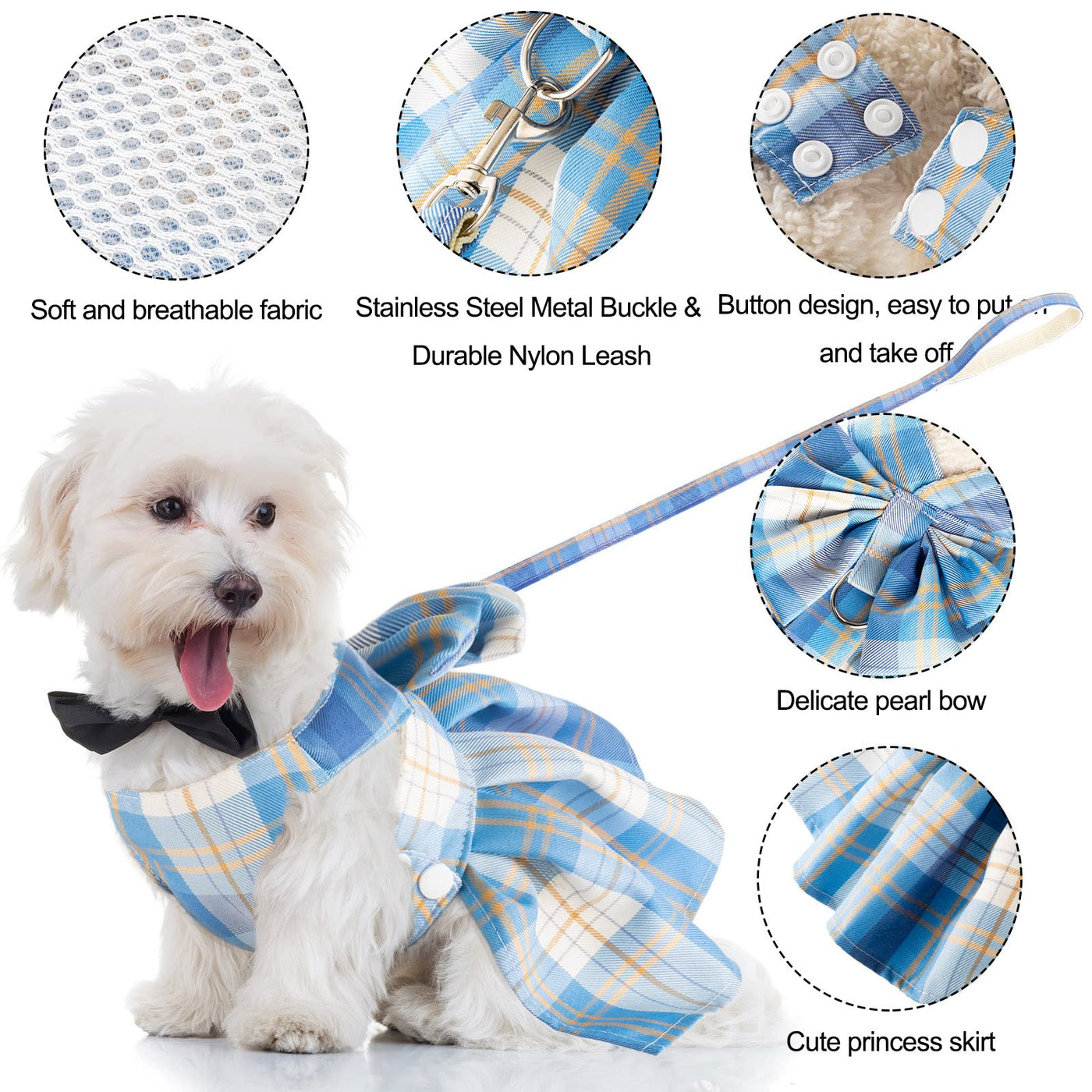 Potchen 4 Pcs Plaid Dog Dress Bow Tie Harness Leash Set Harness Dress For Small Dogs Cute Dog Pet Girl Puppy Summer Clothes For Female Summer Bunny Rabbit Clothes Yorkie Chihuahua Training Walking (S)