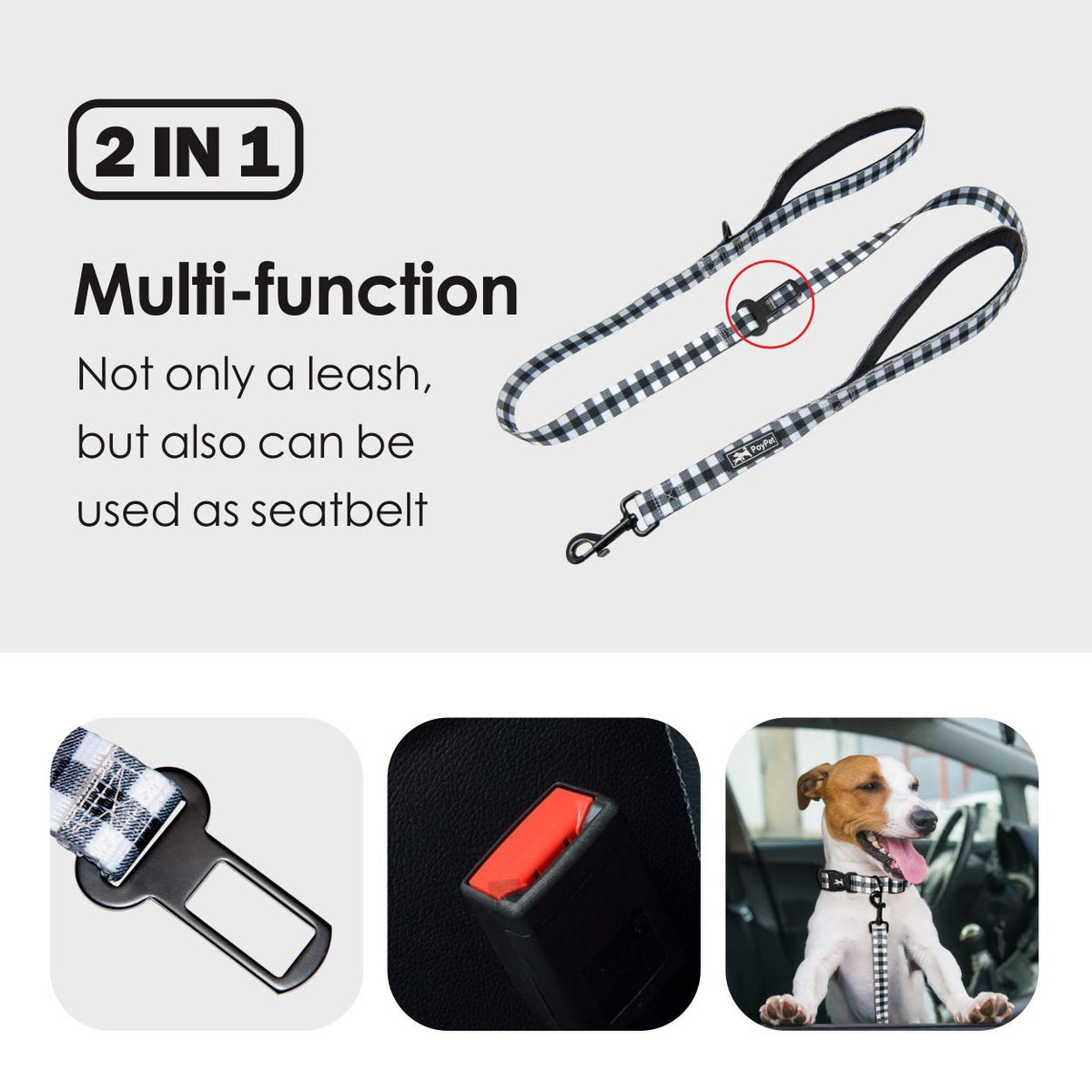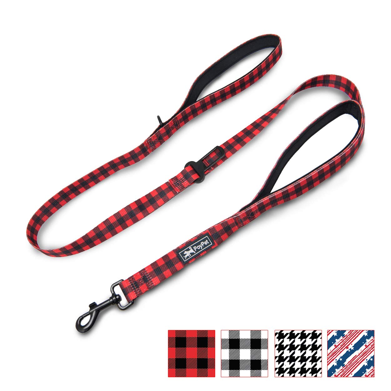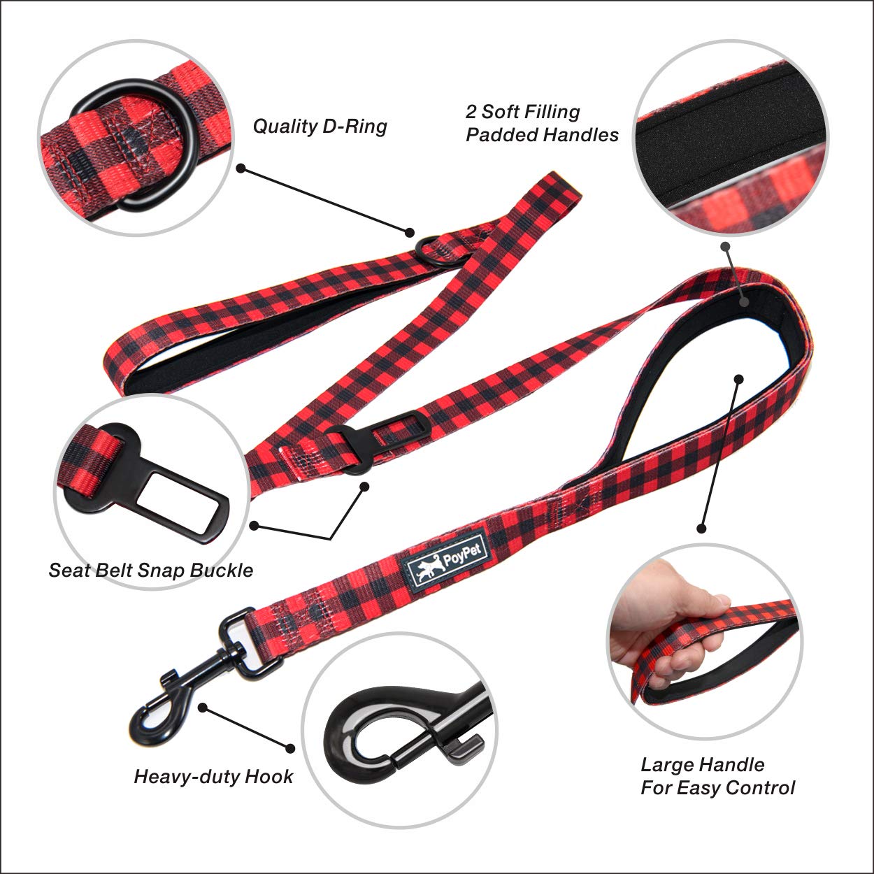 Poypet 5 Feet Dog Leash - 2 Cushioned Handles - Functional Car Seat Belt - Fashionable Pattern, Buffalo Plaid(Checkered Red, L)