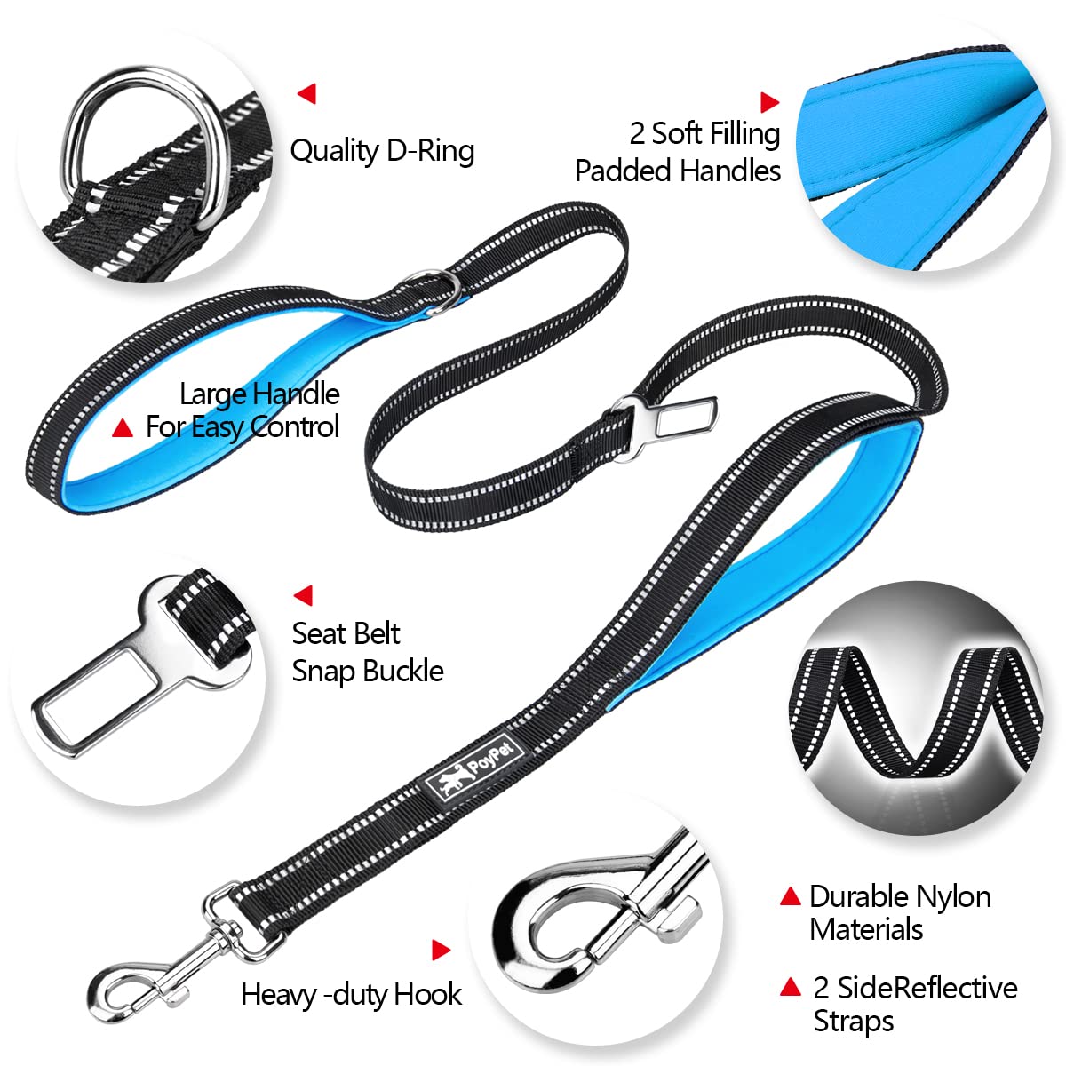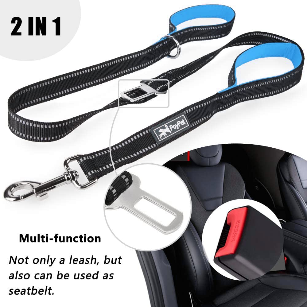 Poypet 5 Feet Dog Leash - 3M Reflective - 2 Cushioned Handles - Functional Car Seat Belt(Blue)